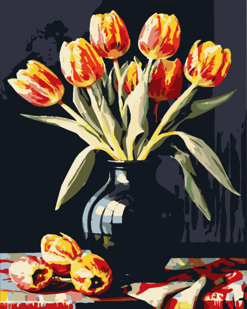 A képen egy elegáns fekete váza emelkedik ki, tele vibráló, narancssárgás-piros szirmú tulipánokkal, amelyek frissességet és életet sugároznak. A háttér sötét tónusa jó csoportosító, amely kiemeli a virágok csodálatos színeit. A vázánál elhelyezkedő háttér anyaga, mint egy sejtelmes színfolt, adják meg a kompozíció izgalmas mélységét. Az asztalon fekvő kerek gyümölcsök és a csipkés textília még inkább fokozzák a jelenet gazdagságát.