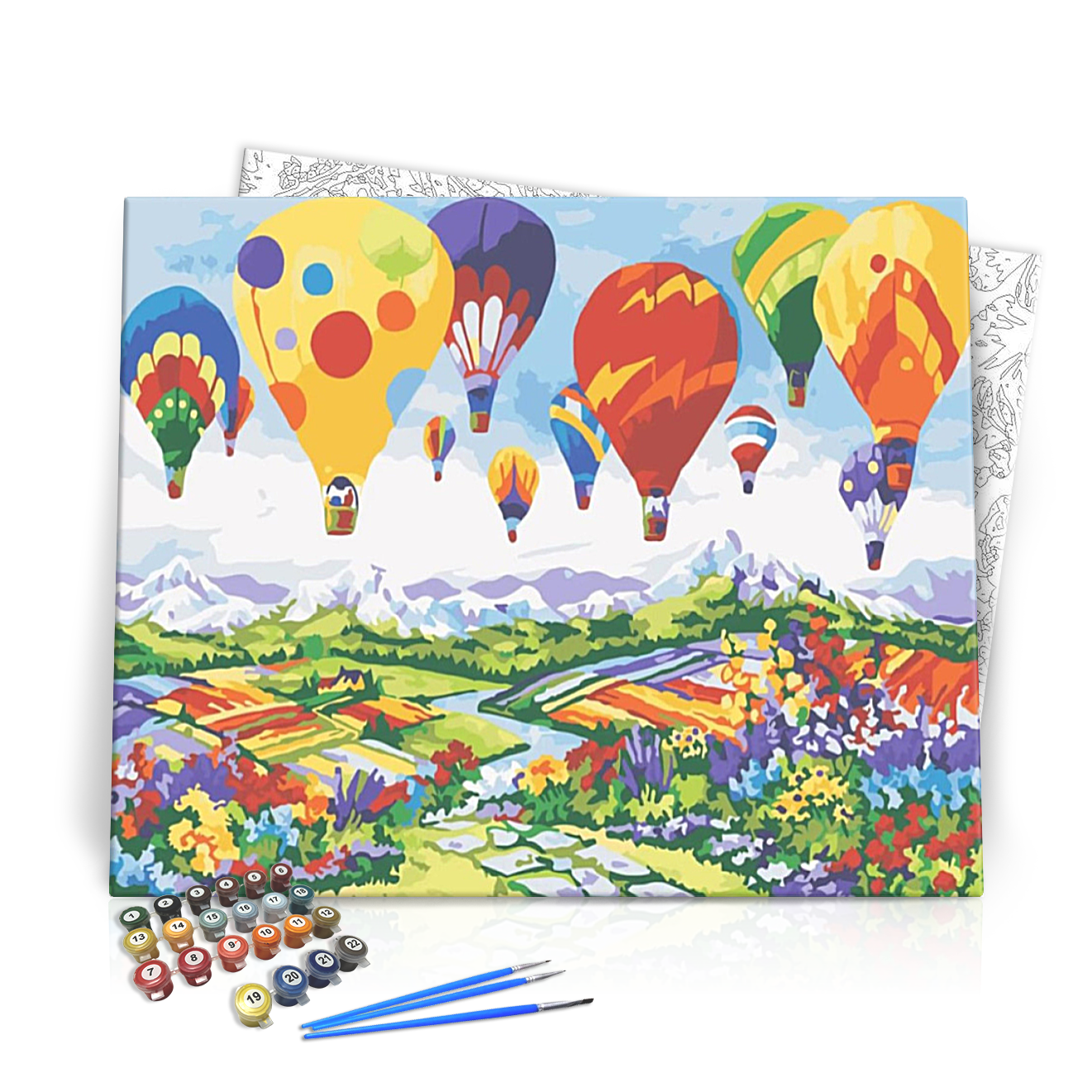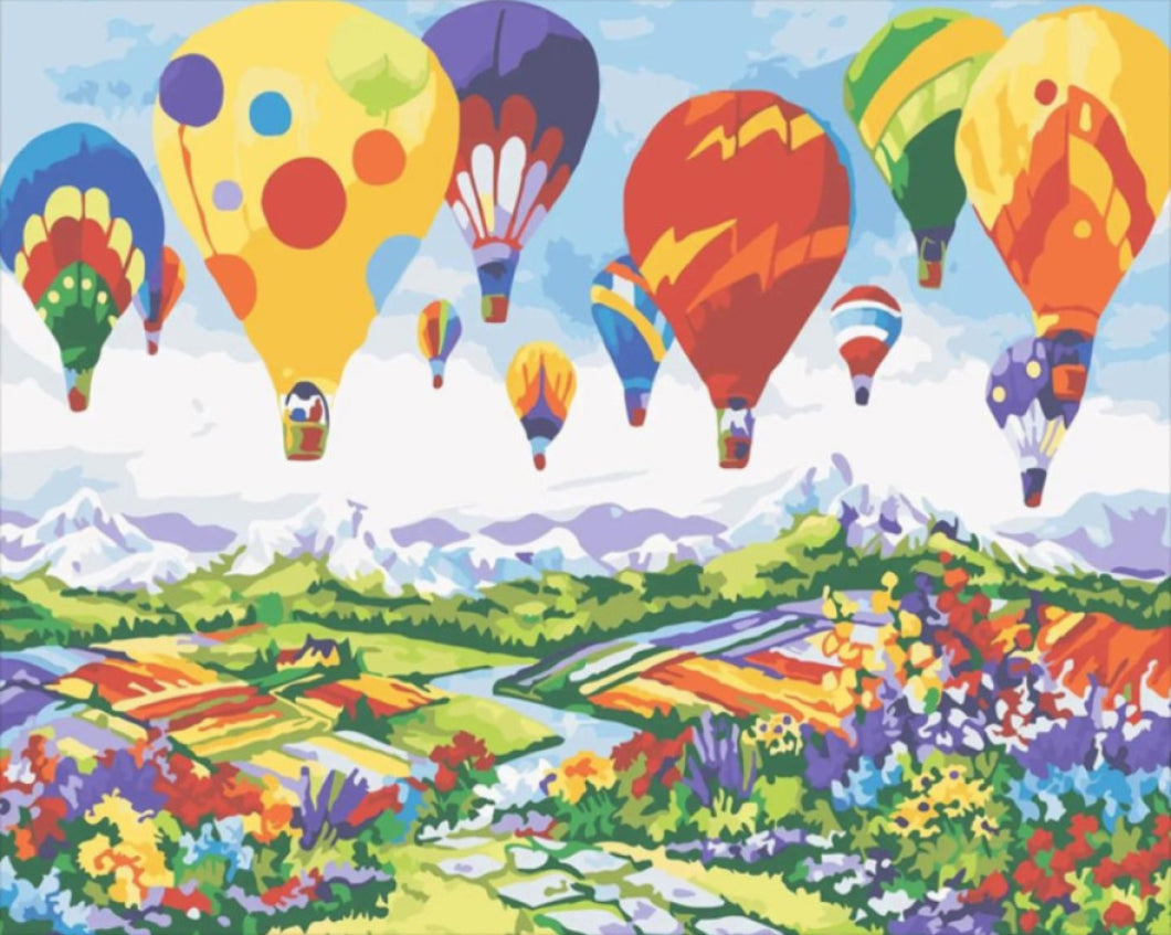 Engedd, hogy elragadjanak a színek varázsa! A 'Látványos színek' számfestő készlet tökéletes választás minden művészlélek számára, aki szeretne egy különleges, lélegzetelállító alkotást létrehozni a könnyed festés élményével. E kép egy idilli vidéket ábrázol, amelyet színes lufik díszítenek, az ég kékjében szárnyalva. A háttérben gyönyörű hegyek és zöldellő dombok láthatók, míg az elülső rész színes virágokkal van tele, amelyek életre keltik a tájat.