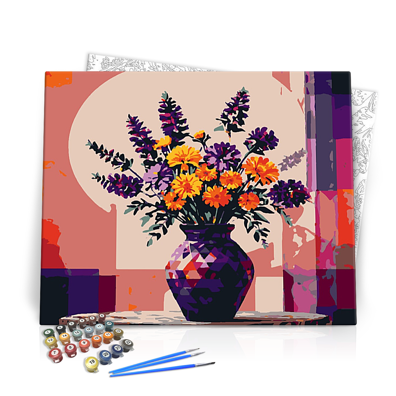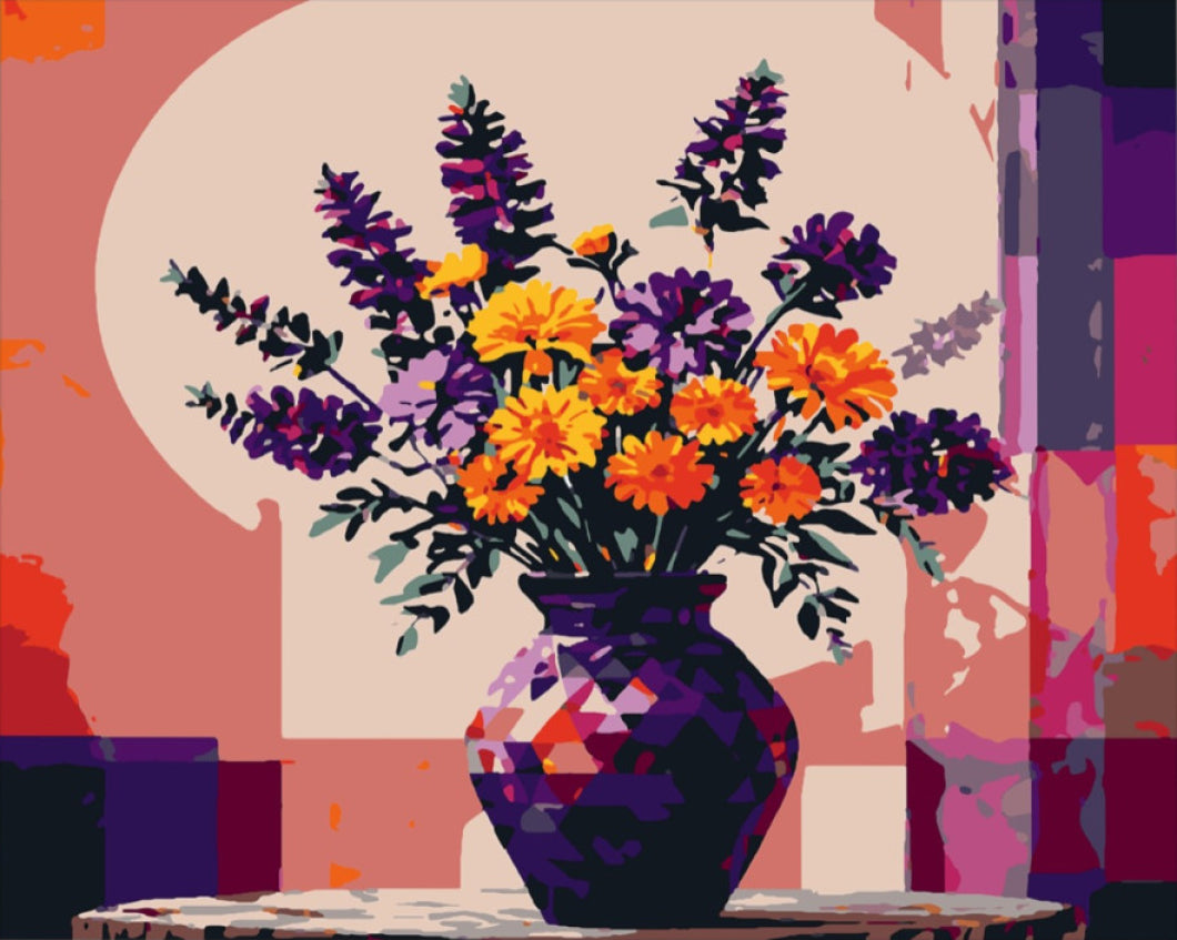 A kép hangsúlyos elemei a sötétlila levendulák és a világos narancs színű virágok, amelyek együtt csodás kontrasztot alkotnak. A háttérben meleg árnyalatok, mint az őszibarack és a piros árnyalatok adják meg a festmény hangulatát, amely a naplemente varázsát idézi. A virágcserép geometrikus mintázata pedig modern, mégis klasszikus érzést kölcsönöz a kompozíciónak.