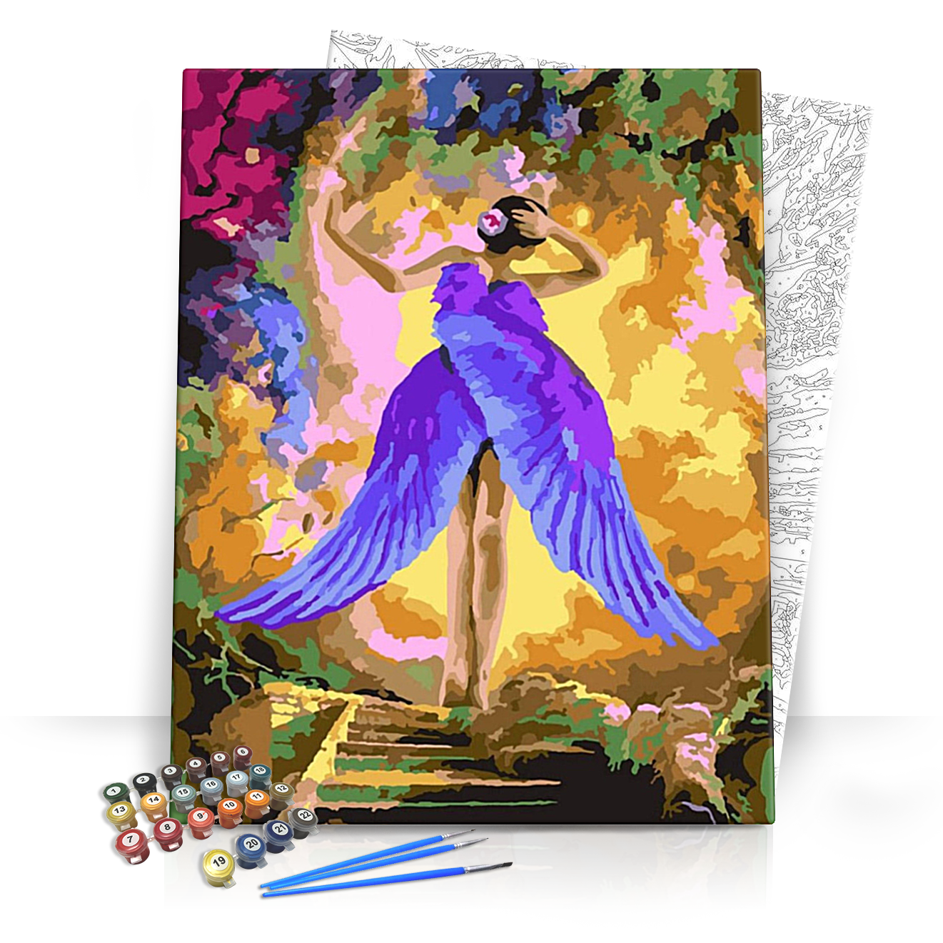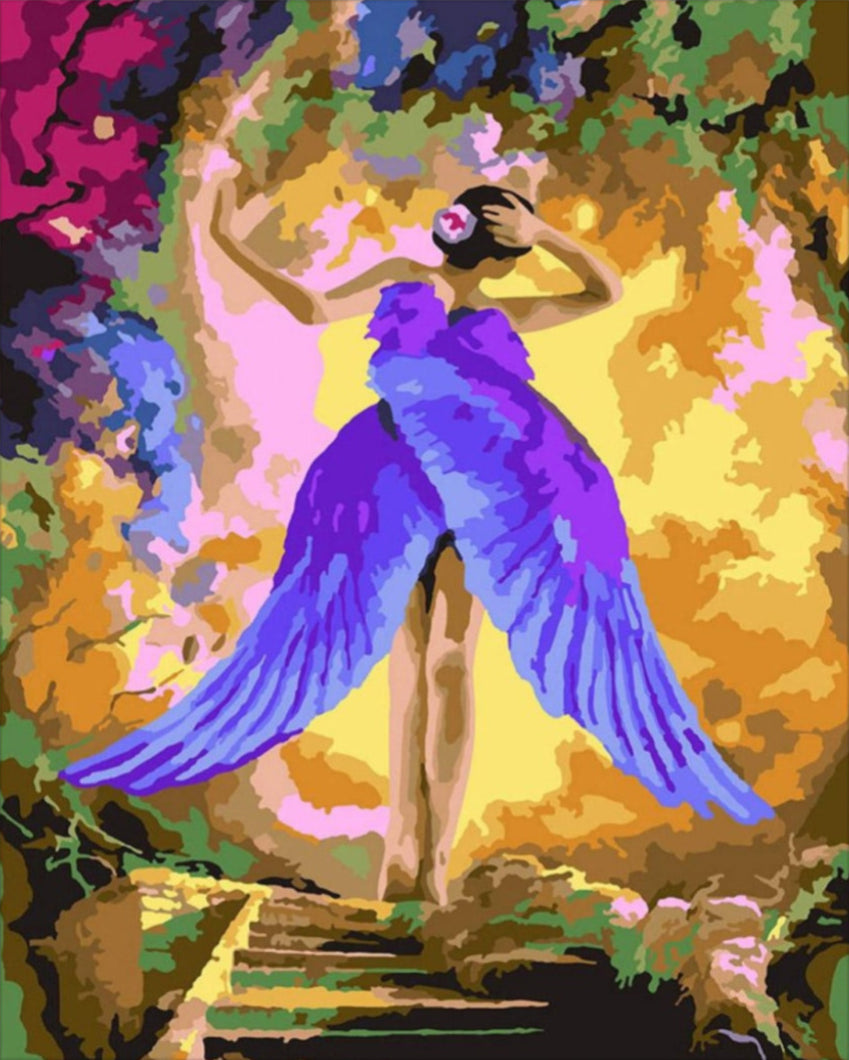 A kép középpontját a káprázatos, lila angyalszárnyak adják, amelyek különleges bájjal ruházzák fel az alakot. A színek élénksége és a finom részletek minden festő számára inspiráló élményeket kínálnak, bármilyen készségi szinten is állsz. A számozott mezők és a kontúrvonalak segítségével lépésről lépésre hozhatod létre ezt a csodás műalkotást, élvezhető előzetes festői tudás nélkül is!