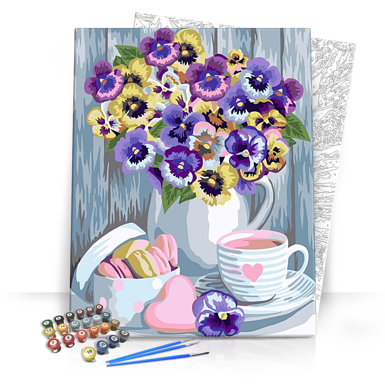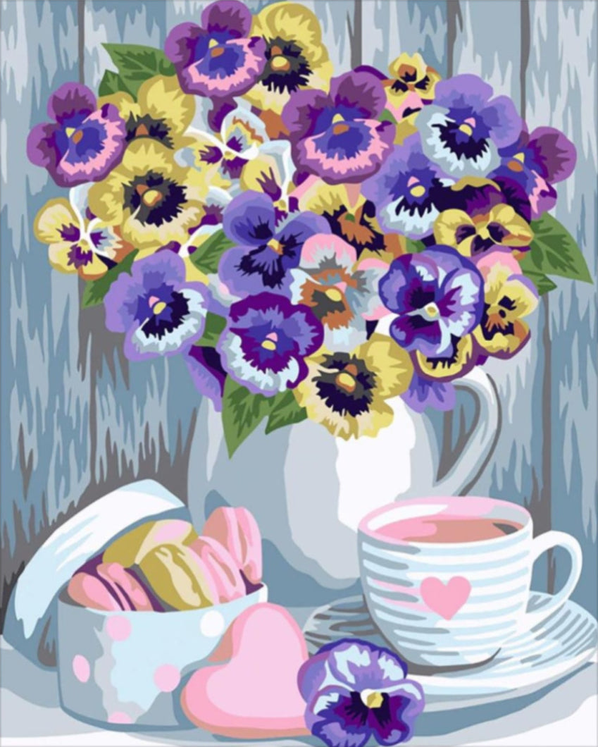 Fedezd fel a kreativitás világát a Macaron teával számfestő készlettel! Ez a csodálatos, virágos kompozíció tele van frissességgel és életerővel, hiszen a lila és sárga árvácskák ragyogóan pompáznak, míg a háttérben a fák szürke árnyalatai egyszerű eleganciát kölcsönöznek. A festmény középpontjában egy hófehér kancsóban elhelyezett virágcsokor áll, amely köré színes macaronok és egy rózsaszín szív alakú sütemény kerülnek, az asztalon egy csodás csésze tea várja, hogy élvezd a pillanatot.
