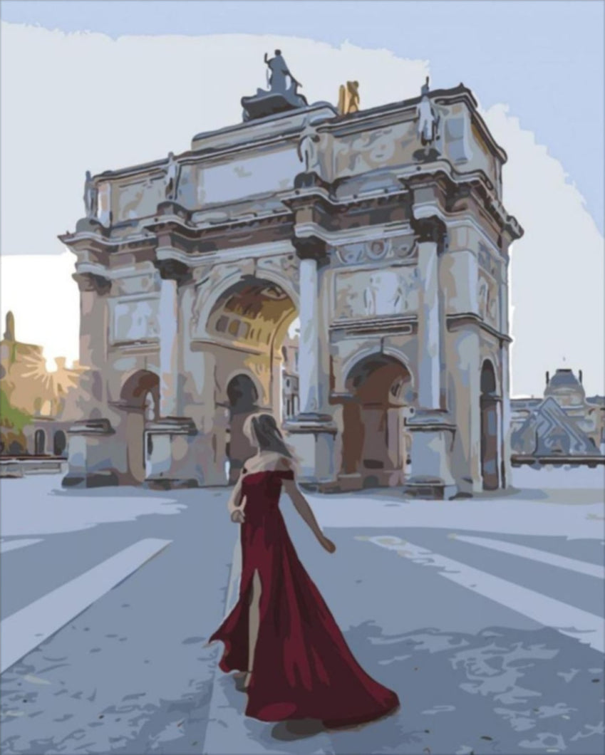 A festmény középpontjában a gyönyörű, piros ruhát viselő hölgy áll, aki egy impozáns, architektúrájával lenyűgöző kapu felé lép. A kép színei harmonikusan, lágyan kék és bézs árnyalatokban játszanak, amit az építmény finom részletei és a lágy háttérfény varázsolnak elbűvölővé.