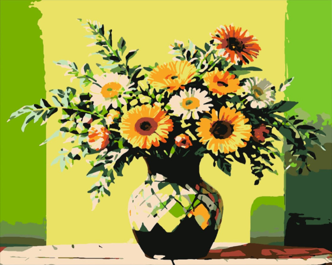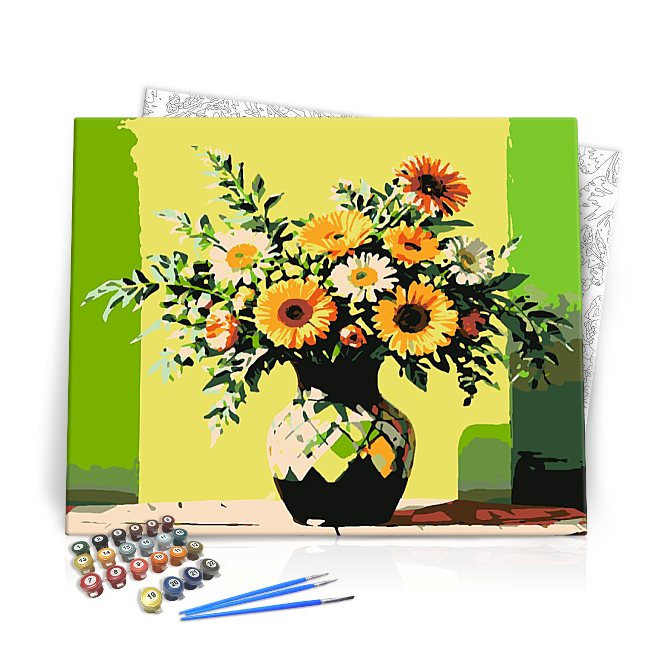 Merülj el a színek tengerében a Margaréta harmónia - számfestő készlet segítségével! A gyönyörű, élénk színekben pompázó virágcsokor vidámságot és frissességet hoz otthonodba. Az egyszerű, mégis stílusos kompozíció, ami egy színes vázát ölel körül, azonnal megragadja a tekintetet, és felpezsdíti a szobák hangulatát. Az örömteli margaréták és napraforgók bájosan dominálnak a vásznon, míg a zöld háttér szimbolizálja a természet harmóniáját.