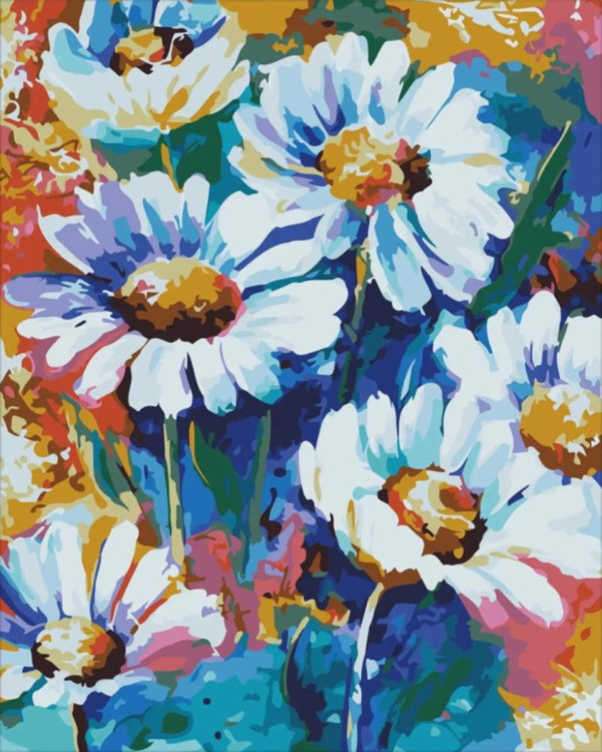 A kép tele van életerővel: a fehér virágok, gazdag sárga középpontjuk körül, lenyűgöző kontrasztot alkotnak a vibráló árnyalatokkal, mint például a kék, zöld és piros. Ez a festmény csodálatosan ötvözi a természet szépségét és a modern stílust, így bármelyik otthonban fenséges díszítést ad.