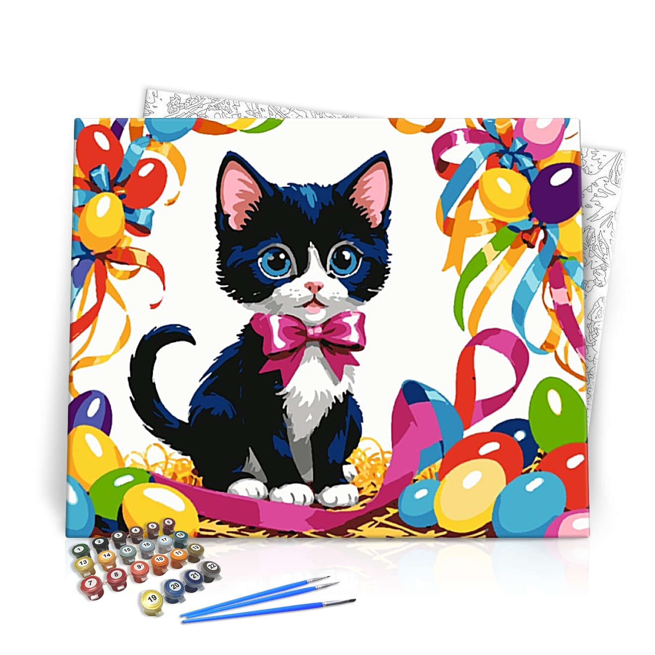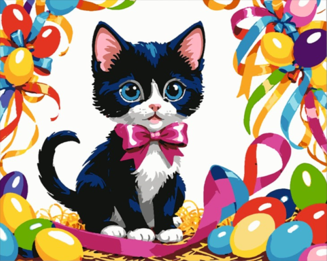 A kép főszereplője egy bájos, masnival díszített kiscica, amely vidám színekben pompázik. A fekete és fehér szőr, valamint a nagy, kék szemek életre keltik a kisállat vonzerejét. A háttérben színes tojások és szalagok találhatók, melyek egy igazi ünnepi hangulatot sugallnak. A színes díszítőelemek harmonikus együttese garantálja, hogy a végeredmény mindenkit elbűvöl.