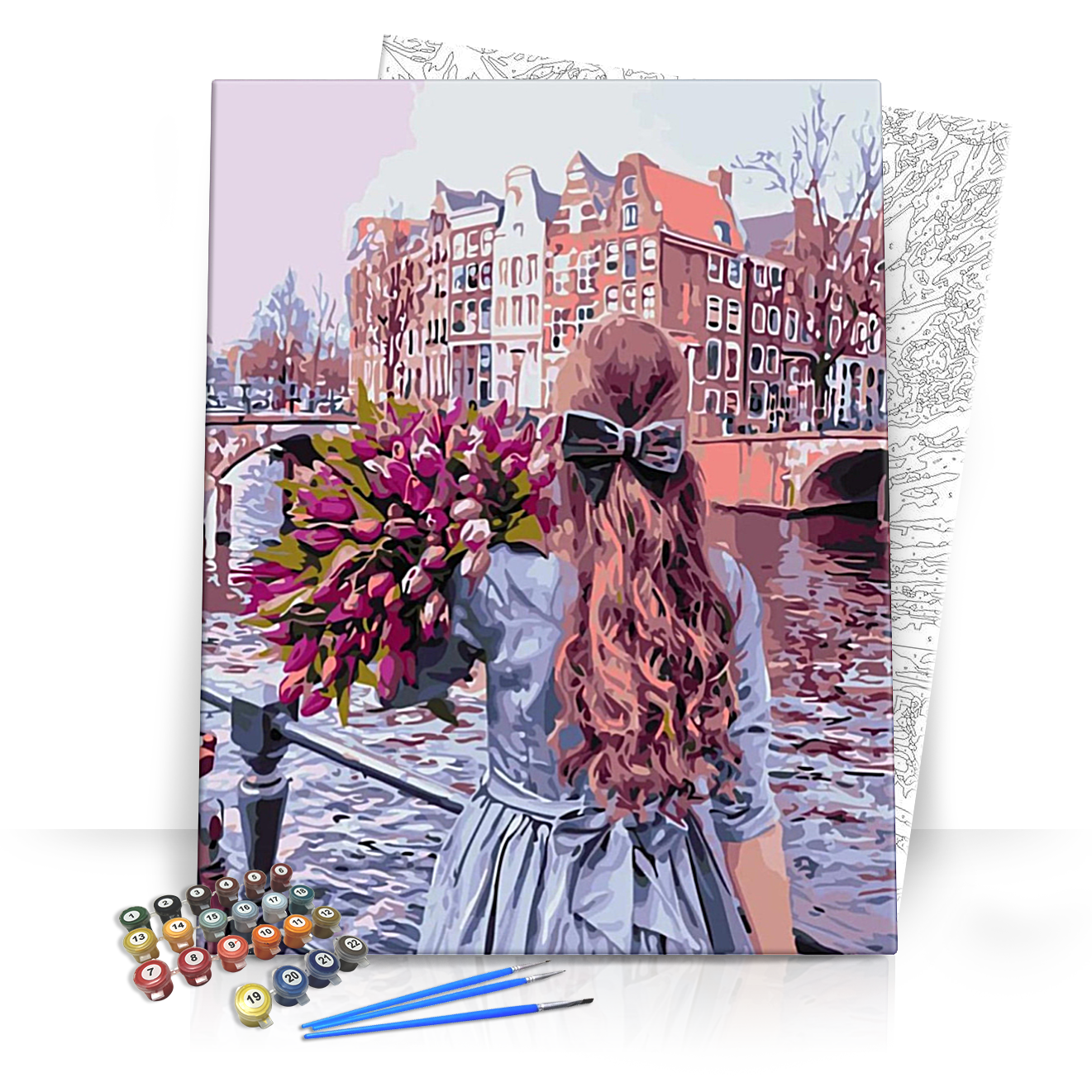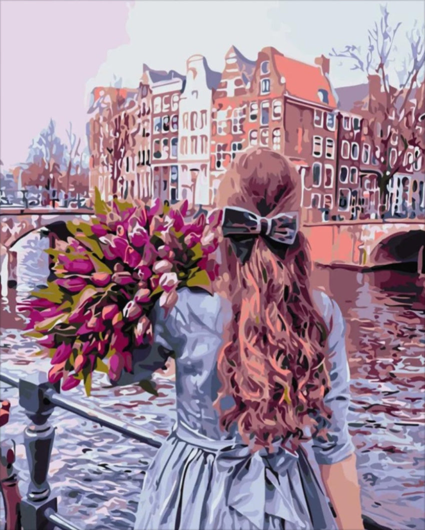 Fedezd fel a kreativitásod! A "Meglepetés - számfestő készlet" tökéletes választás mindazoknak, akik szeretnék átélni a festés varázsát, anélkül hogy előzetes tapasztalatra lenne szükségük. Ez a gyönyörű kép egy bájos hölgyet ábrázol, aki egy virágcsokrot tart a kezében, miközben a festői háttérben csodás amszterdami házak és csatornák tárulnak elénk. A lágy rózsaszínek, zöldek és a virágok élénk lilái harmonikus összhangot alkotnak, amely még a legszigorúbb művészi igényeket is kielégíti.