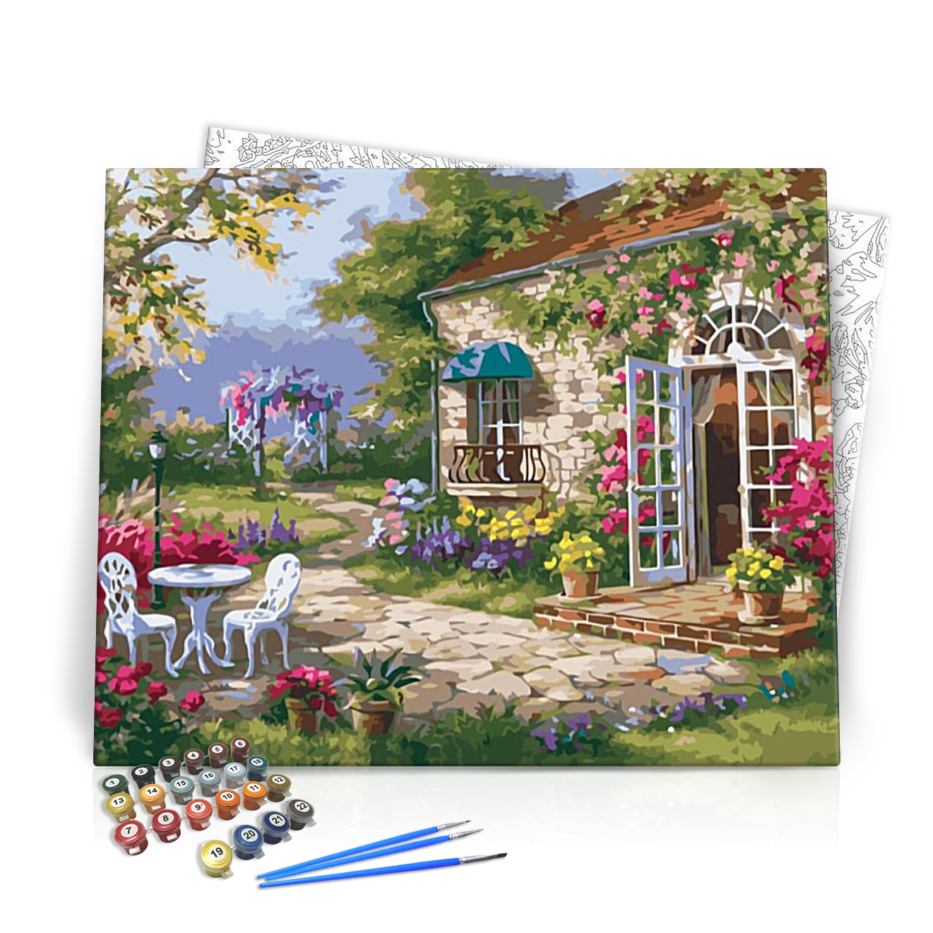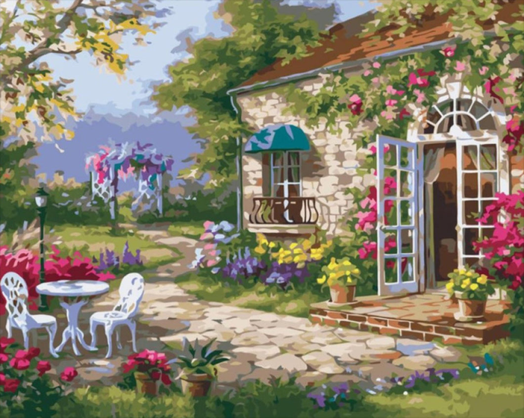 Engedje szabadon kreativitását a Mesekert számfestő készlettel, mely egy varázslatos, virágokkal teli kerteket idéz meg! A festmény, amely a nyár színes pillanatait örökíti meg, a természet szépségét és a klasszikus építészeti elemeket vonultatja fel. A festmény középpontjában egy bájos kőkert található, a napsütötte sétány szélén, melyet gazdag színű virágok és cserépben álló növények díszítenek, míg a berendezett teraszon egy fehér asztal és székek invite az eltöltött pihenésre.