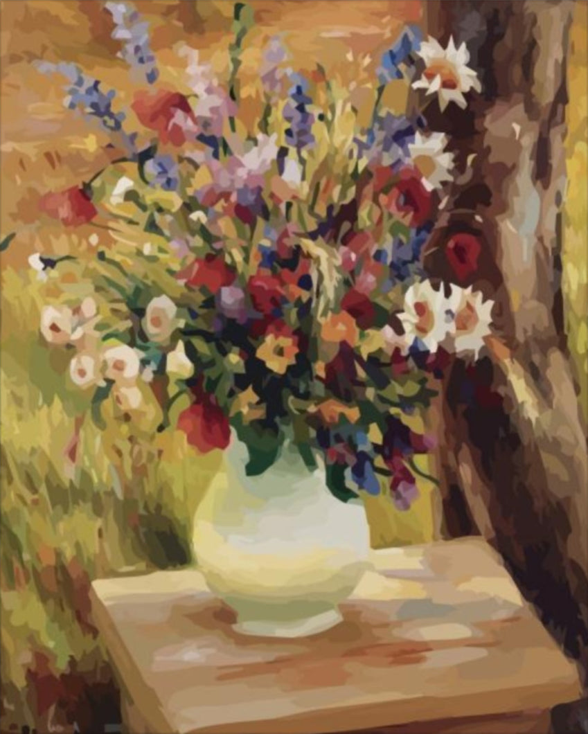 A festmény középpontjában egy szemet gyönyörködtető, virágokkal teli vázát találunk, amely különböző színű és formájú virágok özönével van tele. A háttér lágy, meleg színekben játszik, ami tökéletesen kiemeli a virágok élénkségét. A vázában látható kék, piros, sárga és fehér virágok egyedi elegyet alkotnak, amely szinte életre kelti a festményt.