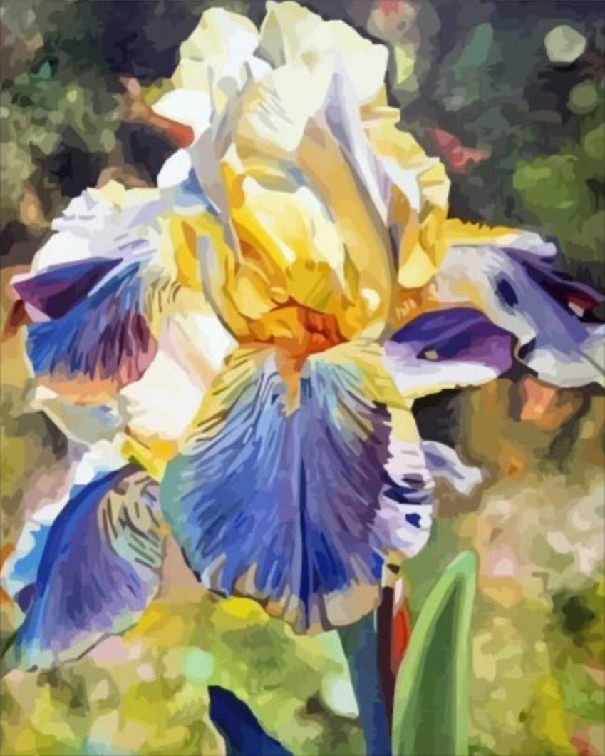 A festmény középpontjában a gyönyörű nőszirom virág áll, amely vibráló színeivel és részletgazdagságával magára vonja a tekintetet. Az élénk sárga, mély kék és lila árnyalatok harmonikusan elegyednek, létrehozva egy érzelmekkel teli kompozíciót. A virág finom szirmai és a háttér lágy, lágy színekkel ölelik körül, amelyek még inkább kiemelik a nőszirom szépségét.