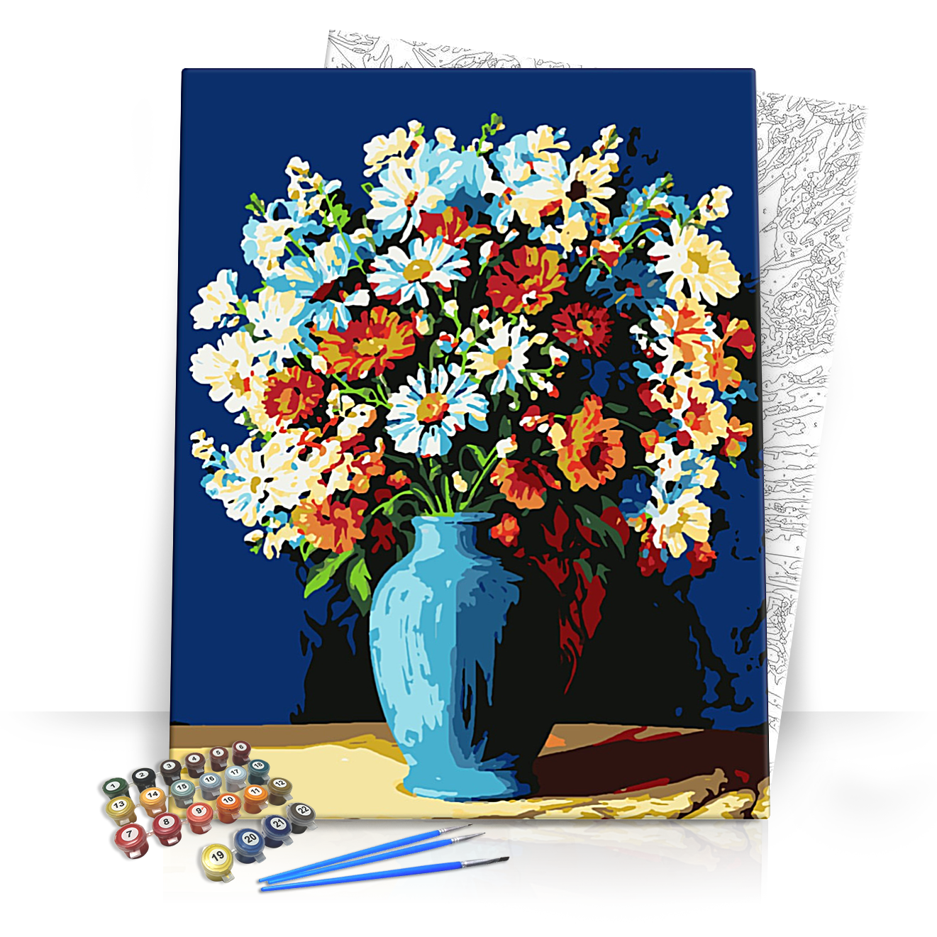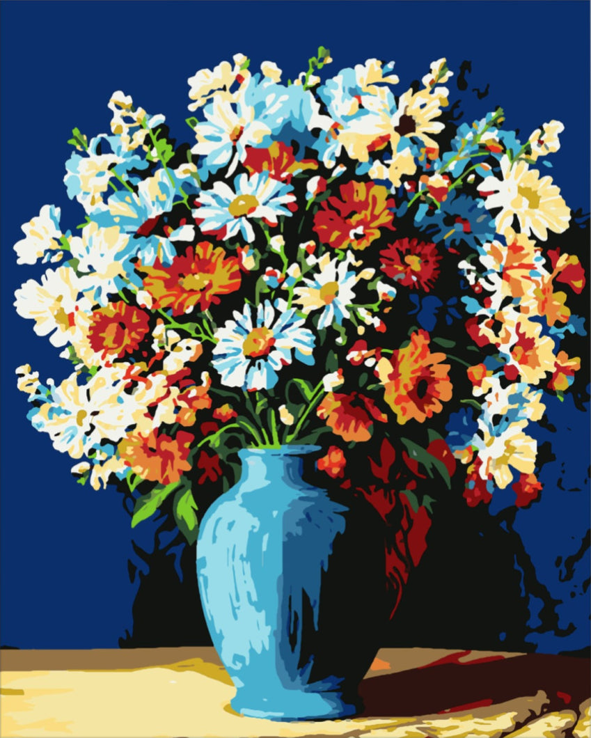 A képen gazdag, színes virágok vontakoznak össze egy különleges kék vázában, miközben a háttérban sötétkék tónusok biztosítják a csodás kontrasztot. Az élénk színek és a részletes kidolgozás teszik ezt a kompozíciót igazi élménnyé minden festő számára.
