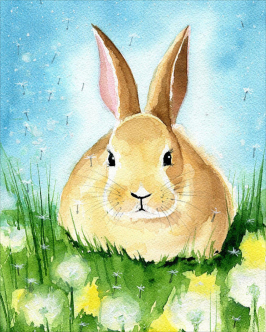 A kép középpontjában egy aranyos, dundi nyuszi áll, akinek tündöklő szemei és kedves arca könnyedén elvarázsolják a nézőt. A zöld fű lágyan hullámzik a szélben, míg a virágok, mint a pitypang és a fű, életet adnak ennek a csodás tájnak. Az ég kék árnyalatai finom részletekkel telítik a hátteret, ami tökéletes kontrasztot ad a nyuszi meleg színével.