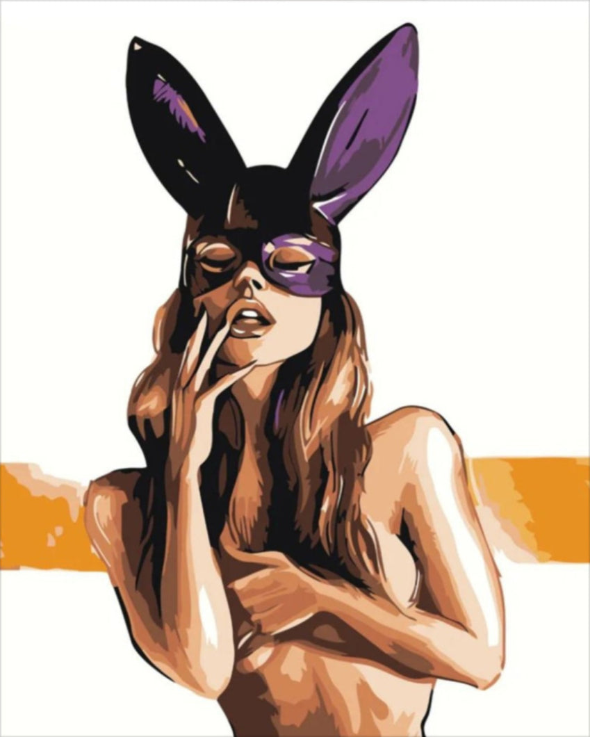 A készleten szereplő művészeti alkotás egy fiatal női alakot ábrázol, aki titokzatos és játékos stílusban mutatkozik be. A hölgy egy szexi nyuszi maszkot visel, nagy, feltűnő lila fülekkel, ami kiemeli egyedi vonásait. Az arckifejezése üzenetet hordoz: a kíváncsiság és a játékosság keveréke. A kompozíciót a meleg földszínek, mint a barna és narancs árnyalatok, valamint a tiszta háttér és a dinamikus vonalak teszik élénkebbé.