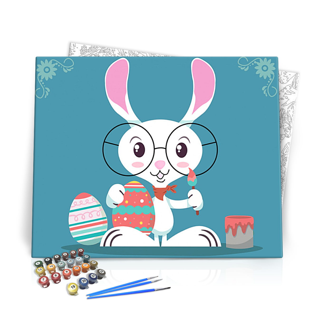 Fedezd fel a kreativitás világát a Okos Nyuszika - húsvéti számfestő készlettel! Ez a színes és vidám készlet tökéletes választás mindenki számára, aki szeretne kikapcsolódni és elmerülni a festés örömében. A bájos nyúl karakter, aki szemüveget visel és színes tojásokat fest, minden gyermeki szívet megdobogtat. A háttér lágy kék árnyalata és a mintás tojások varázslatos ünnepi hangulatot árasztanak.