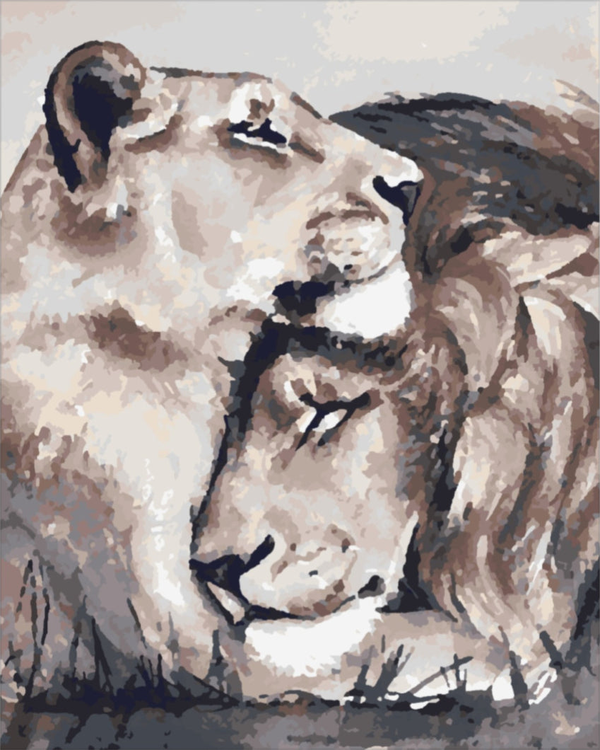 A kép gyönyörű, meleg színekkel és lágy árnyalatokkal játszik, tökéletes a színek harmóniáját kedvelő művészeknek. Az oroszlánok impozáns megjelenése, az együttlétük egyfajta nosztalgiát és boldogságot sugall, így a kifestés élménye biztosan megszépíti majd a napodat.