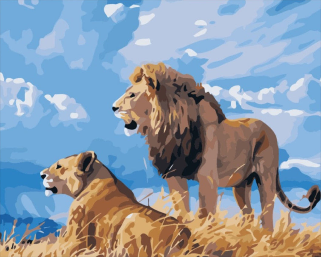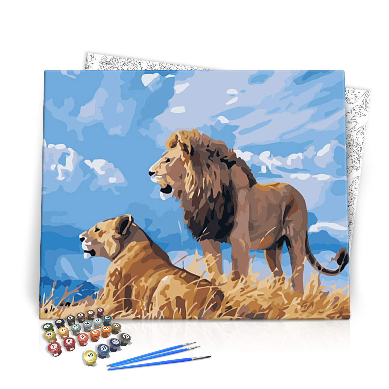 Merülj el a természet varázslatos szépségében az Oroszlánpár - számfestő készlet segítségével! Ez a gyönyörű festmény két impozáns oroszlánt ábrázol, akik nyugodtan ülnek a csodás afrikai tájban, a napfény játékával játszó felhők alatt. A lágy kék háttér és a sárgás barna fű harmonikusan együtt alkotja a festmény lenyűgöző atmoszféráját, amely életre kelti a vadon szépségét az otthonodban.
