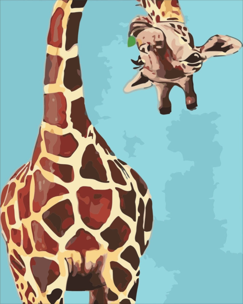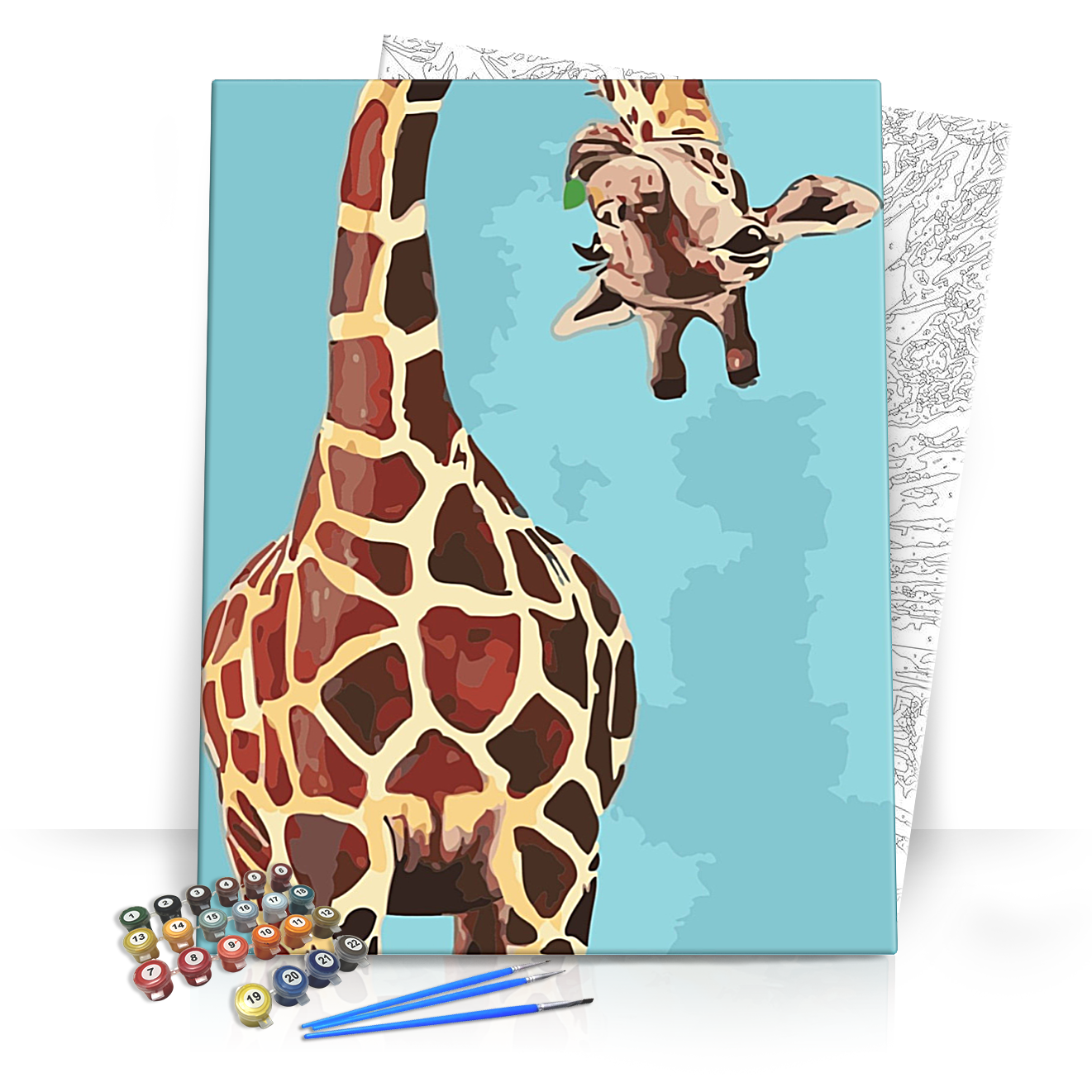Fedezd fel a festészet világát az Őrűlt Zsiráf számfestő készlettel! Ez a lendületes és színes műalkotás garantáltan feldobja a napjaidat. A kép középpontjában egy aranyos zsiráf áll, aki kíváncsian néz le ránk, míg a háttérben egy friss, élettel teli kék égbolt tündököl. A zsiráf jellegzetes foltjai és részletes vonásai életre keltik ezt a fajta művészetet, és a festés során egy igazi kis csodát alkothatsz.