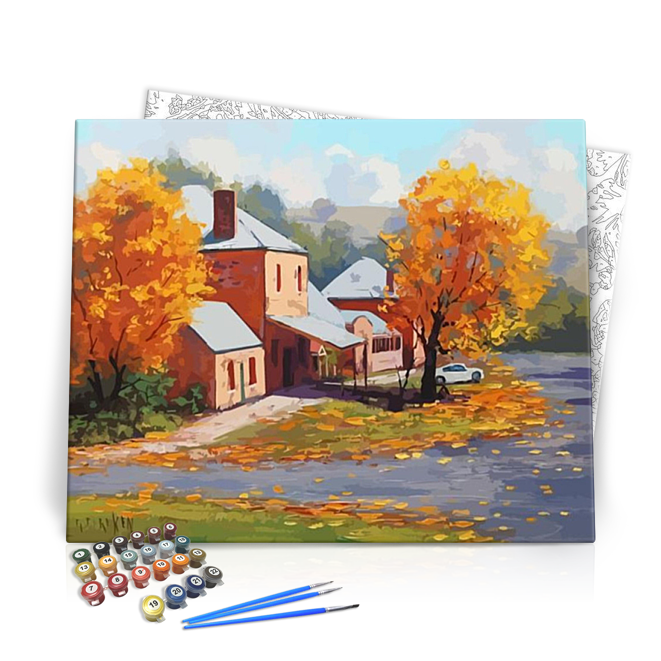 Merülj el az őszi varázsban ezzel a lenyűgöző **számfestő készlettel**, amely lehetővé teszi, hogy pepecselés közben egy gyönyörű tájat alakíts ki a saját képzeleted szerint! A festmény, mely egy festői házat ábrázol élénk narancssárga és sárga lombú fák között, valódi meghittség érzetét kelti, miközben a gyönyörűen kék ég hátranyúlik a távolban. A képen látható őszi fák egyedi színpompájukkal és a háttérben megbújó épületekkel garantáltan a természet szépségét varázsolják eléd.