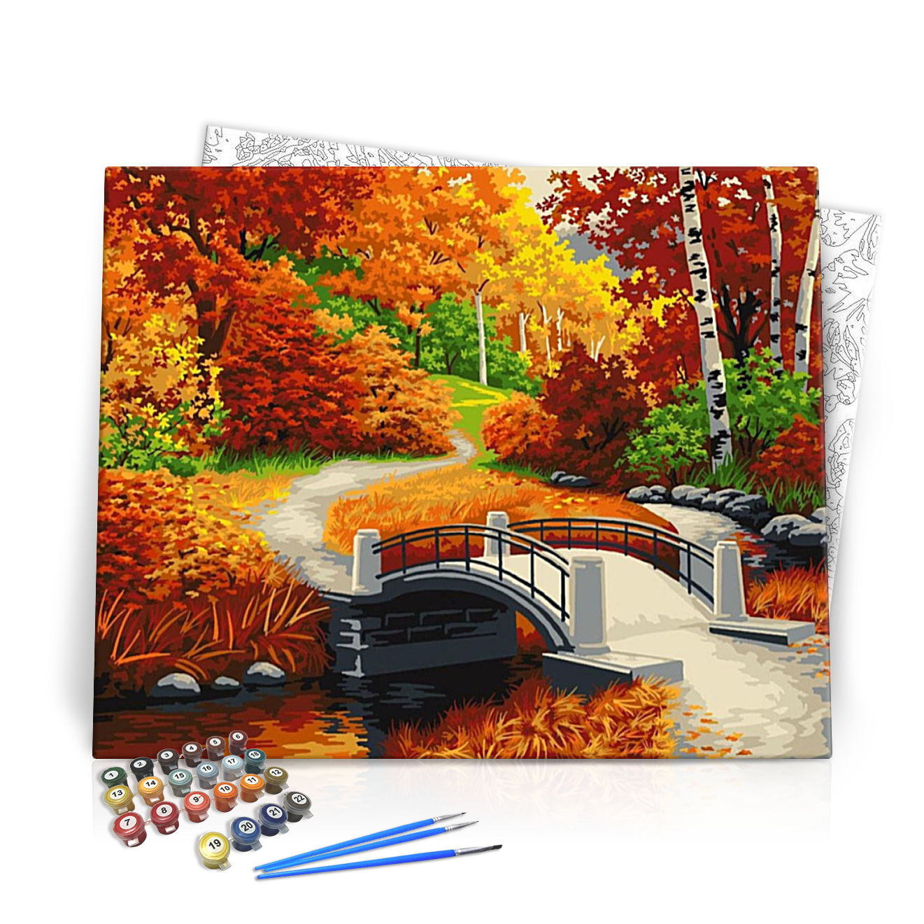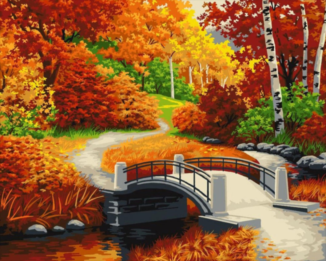 Merülj el az őszi természet csodáiban ezzel a festői szépségű képpel, amely egy békés séta ösvényét tárja eléd a parkban. Az élénk narancs, sárga és zöld színek harmonikus elegye üde hangulatot teremt, míg a híd és a víz tükörképe mélyebb dimenziót ad a látványhoz. Ez a lenyűgöző tájkép ideális választás a kreatív időtöltéshez, hiszen a kitűnő részletek és a gazdag színpaletta biztosítja, hogy mindenki megtalálja benne a festői örömét.