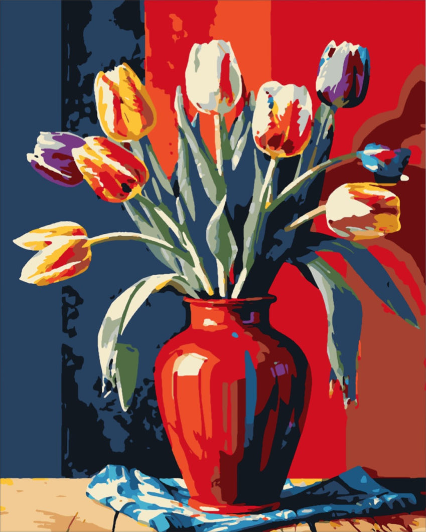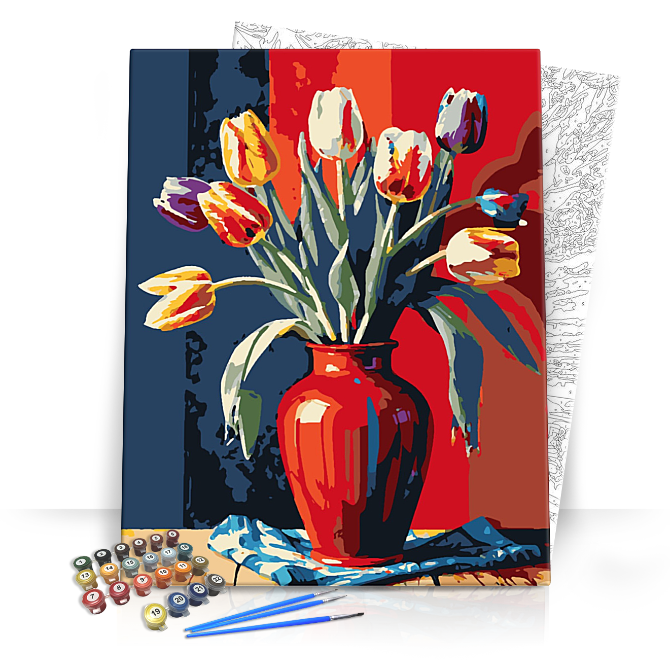 Merülj el a festés örömében a Piros vázában a boldogság színei számfestő készlettel! Ezzel a lenyűgöző kiemelkedő tulipános műalkotással a saját otthonodba varázsolhatod a tavasz frissességét és színeit. A fő elem, a ragyogó piros vázában pompázó virágok, melyek fenséges sárga, vörös és lilás árnyalataikban ragyognak. A háttér élénk, geometrikus színátmenetekkel tűnik ki, ami még inkább kiemeli a vázát és a benne elhelyezett boldog tulipánokat. Az összhatás egy üde, modern hangulatot teremt, amely mindenki szívét megdobogtatja!