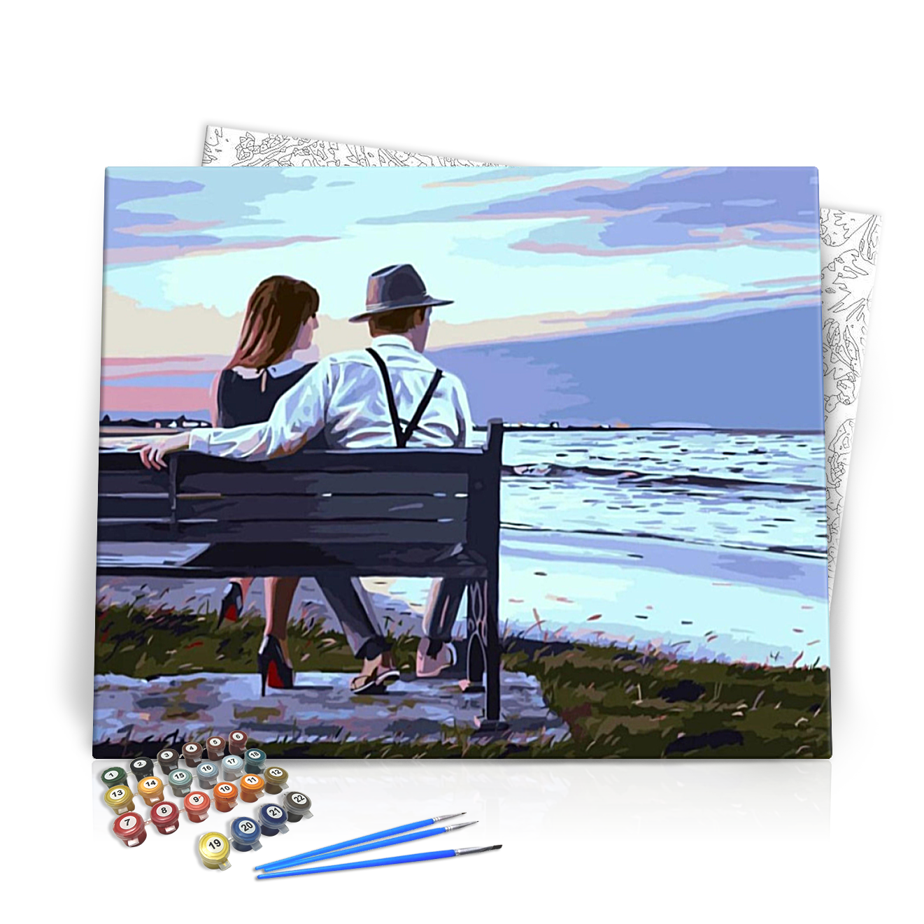 Merülj el a művészet élvezetében ezzel a varázslatos számfestő készlettel, amely egy romantikus pillanatot örökít meg a parton. Az alkotás főszereplői egy fiatal pár, akik a naplementében, a tenger hullámainak lágy zenéjére ülnek egy padon. A festmény csodás színek játékával és letisztult vonalaival idézi meg a nyári estéket, amikor az idő megáll és csak a szerelem létezik.