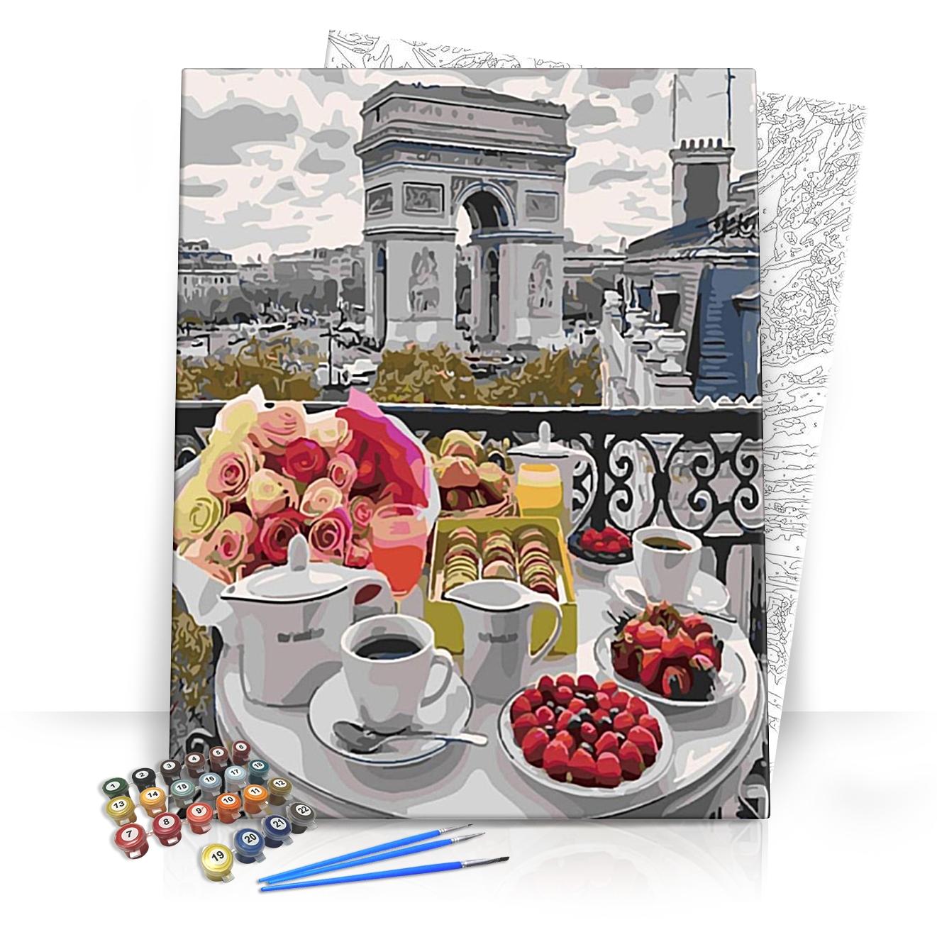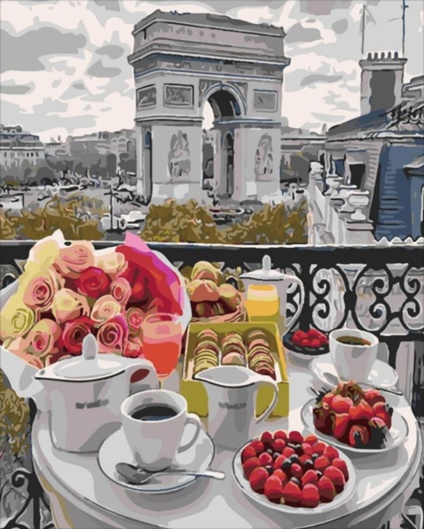A festményen egy gyönyörű erkély jelenik meg, háttérben a híres Diadalív látható, amely Párizs ikonikus szimbóluma. Az asztalon ínycsiklandó reggelit találunk: friss gyümölcsök, édes macarons, egy csésze kávé és elegáns teáskanna. Az asztalon elhelyezett rózsák színkavalkádban pompáznak, egy kagyló alakú tányérban pedig étvágygerjesztő sütemények várják, hogy felejthetetlen pillanatokat szerezzenek Önnek.