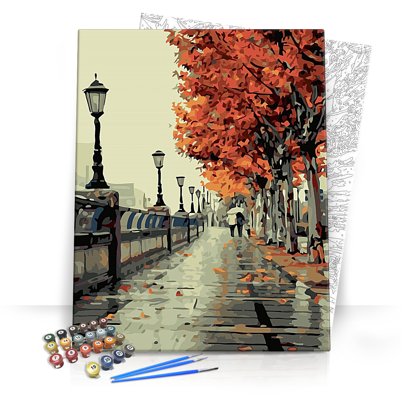 Merülj el a romantika és a színek kavalkádjában ezzel a lenyűgöző számfestő készlettel! A "Romantikus Szerelem Ősszel" kép egy gyönyörű, őszi sétát ábrázol, ahol a narancssárga és vörös falevelek a fák ágain pompáznak, míg a csepegő eső tükröződik a csillogó kövezetén. Az utcai lámpák lágy fényét az elmosódott háttér teszi még hangulatosabbá, élénkítve a sétálók romantikus pillanatait. Az esernyős pár mesébe illő jelenete még varázslatosabbá teszi az őszi tájat.