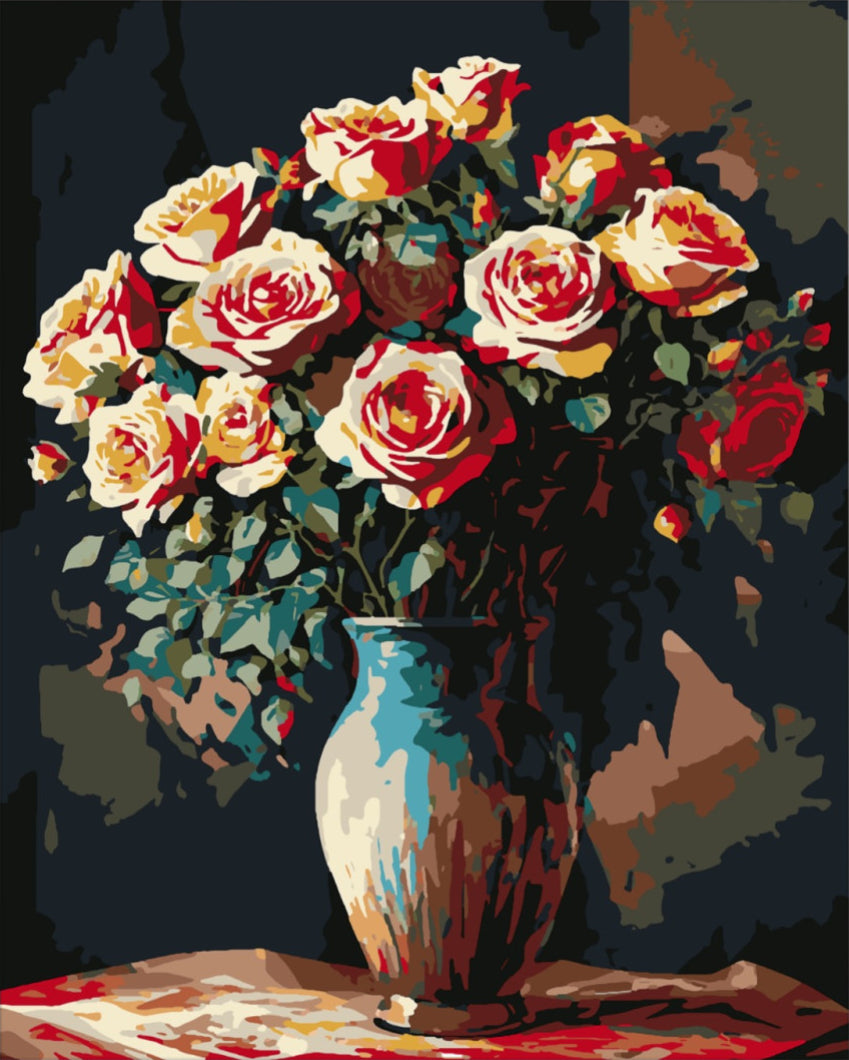 A kép stílusa a klasszikus virágcsokor tematikájára épít, élénk színek és mély tónusok jellemzik. A rózsák árnyalatainak változatossága – a világos sárgától a mély pirosig – és a sötét háttér kontrasztja lenyűgöző látványt nyújt. A finom részletek és a különböző árnyalatok harmonikus játéka teszi ezt a képet igazán különlegessé.
