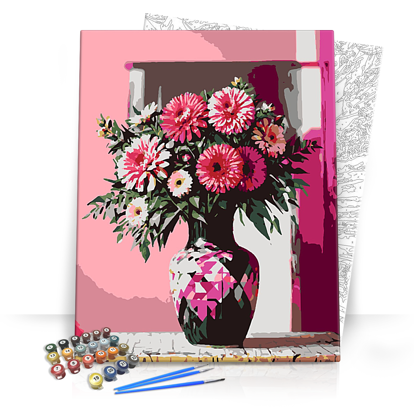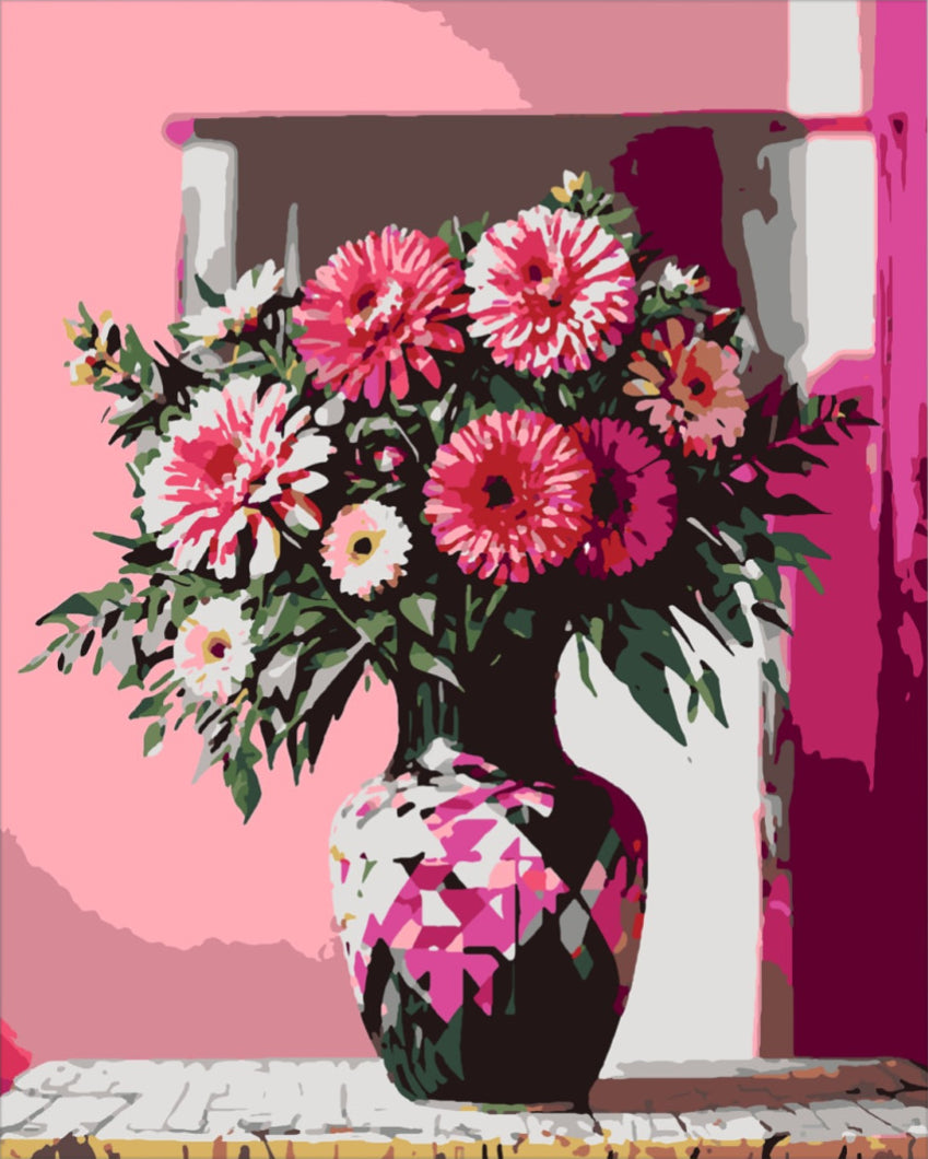 Fedezd fel a kreativitás birodalmát a "Rózsaszín árnyékok" számfestő készlettel! Ez a lenyűgöző kép, tele virágokkal, amelyeket egy elegáns vázában találsz, a rózsaszín különböző árnyalataiban tündököl. A gyönyörű színek, mint a lágy rózsaszín, fehér, és a vibráló piros csodás kontrasztot alkotnak, míg a természetes zöld levelek nélkülözik a színpompát, és életet adnak a kompozíciónak. A vázán lévő geometriai minták izgalmas textúrát és dinamizmust kölcsönöznek a képnek.