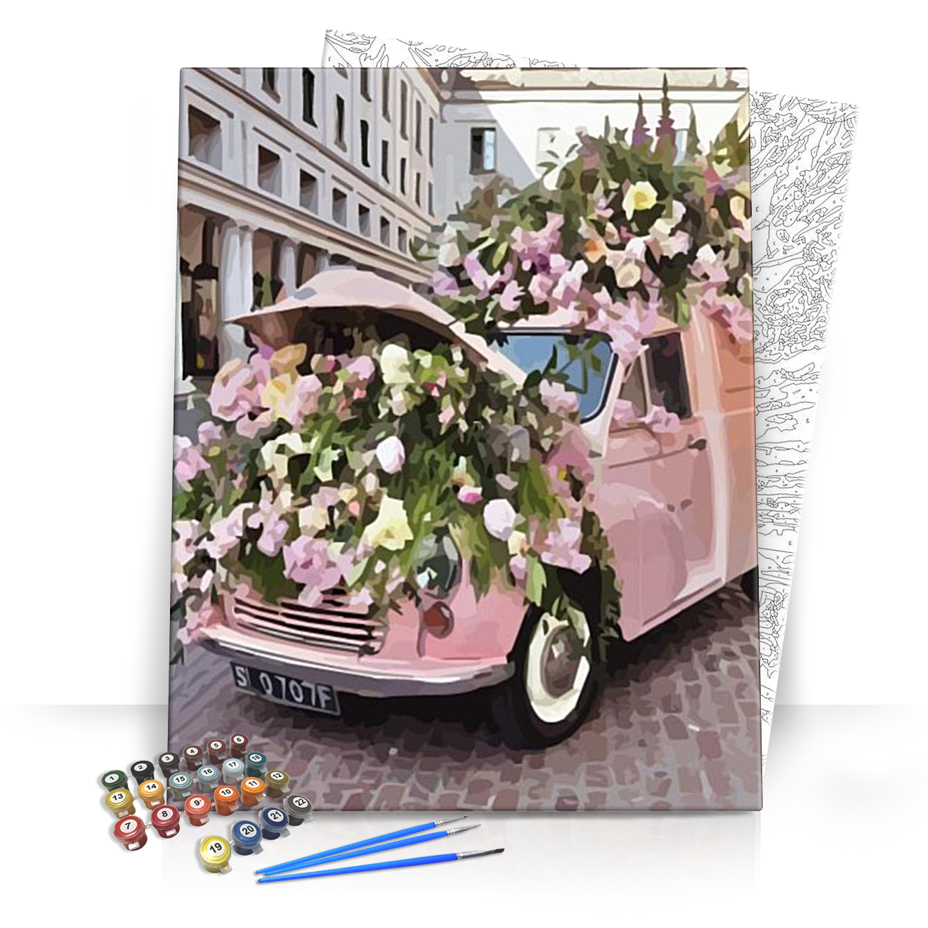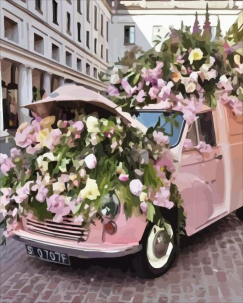 Rózsaszín autó virágokkal - számfestő készlet