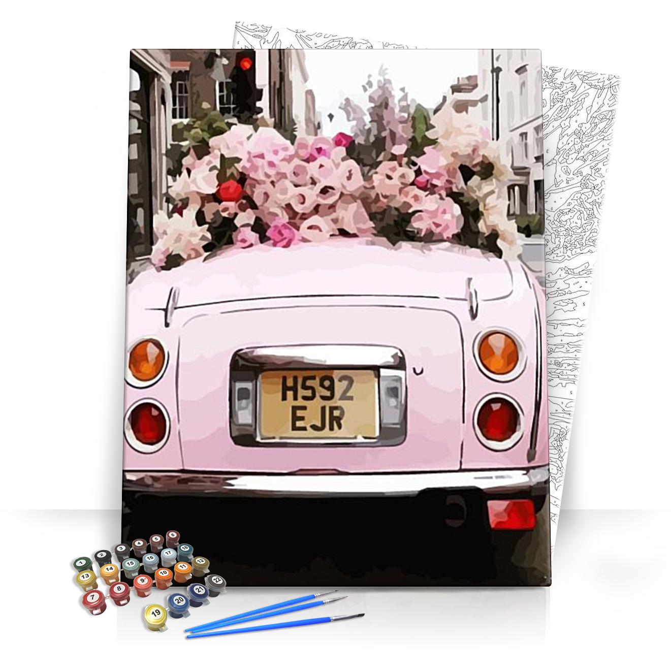 Fedezd fel a kreativitás világát a Rózsaszín autó2 számfestő készlettel! Ez a lenyűgöző műalkotás az elképzelésedet válthatja valóra, miközben varázslatos színeket és formákat hozol létre. A festmény középpontjában egy bájos, rózsaszín autó áll, amelyet gyönyörű, színes virágok díszítenek. A háttér városi tájja és a növények élénk színei egy vidám, életörömteli hangulatot árasztanak.