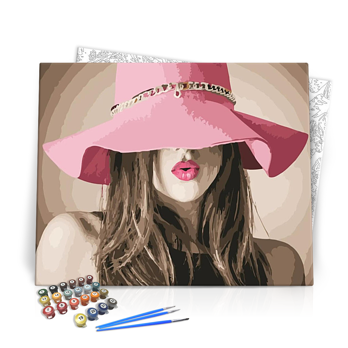 Fedezd fel a kreativitás birodalmát a Rózsaszín kalapban számfestő készlettel! Ez a lenyűgöző kép, amely egy elegáns női alakot ábrázol, a stílus és a színpompás szépség megtestesítője. A lágy rózsaszín kalap, a gazdag ajkak és a dús, hullámos haj mind egy vonzó és titokzatos kisugárzást sugall, amely elvarázsol. A háttér finom, semleges tónusa pedig kiemeli a főszereplő varázsát, így a festmény bármilyen enteriőr szemet gyönyörködtető díszévé válhat.