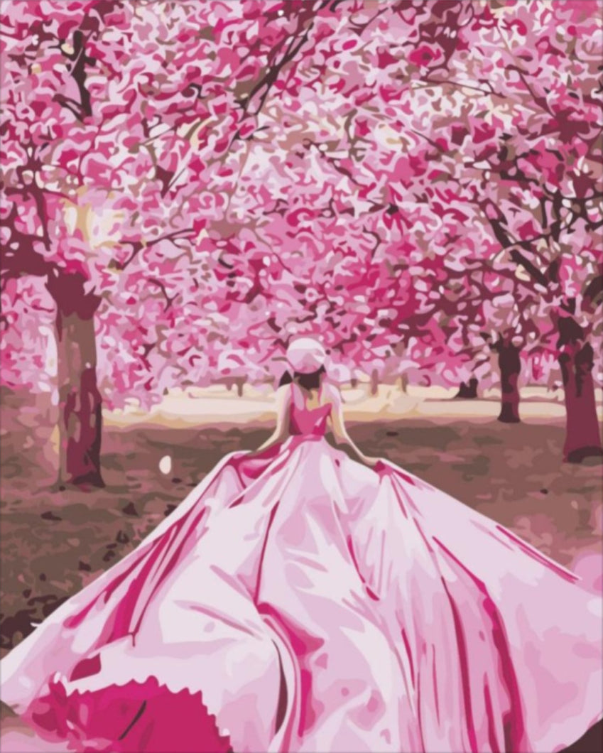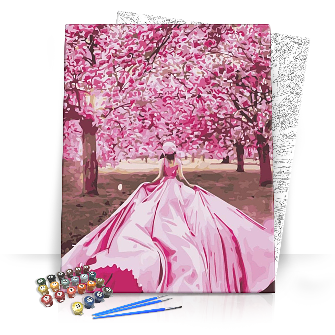 Fedezd fel a kreativitás örömét a "Rózsaszínben" számfestő készlettel! Ez a csodás készlet lehetővé teszi számodra, hogy elmerülj a festészet világában, és létrehozd saját műalkotásodat, amely a szerelem és a szépség színpadává válik. A rózsaszín virágfák alatt sétáló női alak, aki a mesés, lebegő rózsaszín ruhájában sugallja a bájt és a titokzatosságot, készen áll, hogy megelevenedjen a kezeid között.