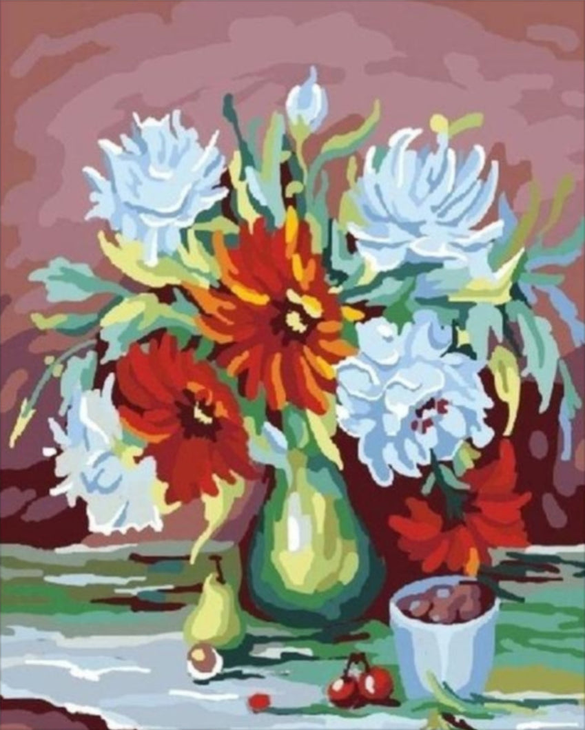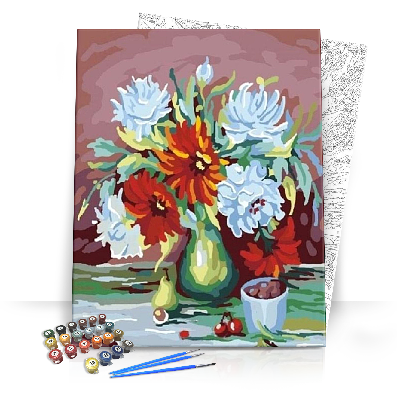 A zseniális kompozícióban középpontban egy zöld vázában elhelyezett, vörös és fehér virágok állnak, miközben a háttérben lágy, meleg színek bontakoznak ki. Az alkotás színei között megtalálható a vibráló piros, a tiszta fehér, a barna, valamint a zöld különböző árnyalatai, melyek tökéletes összhangot teremtenek, ezáltal ideális választássá teszik a számfestést a relaxáció és a kreativitás elősegítésében.