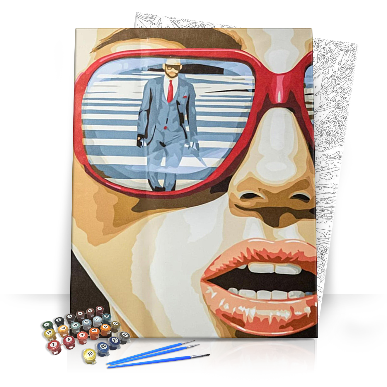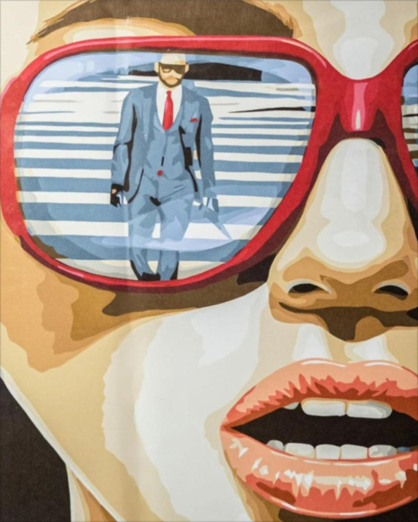 A festmény témája egy lenyűgöző és karakteres portré, amely a modern szerelem esszenciáját ábrázolja. A kép középpontjában egy női arc áll, amely színes napszemüvegben pózol, miközben a lencséjén egy elegáns férfi visszatükröződik. A beállítás dinamikus, a háttér visszafogott, míg a napszemüveg élénk piros színe kiemeli a figura bátorságát és a határozottságot.