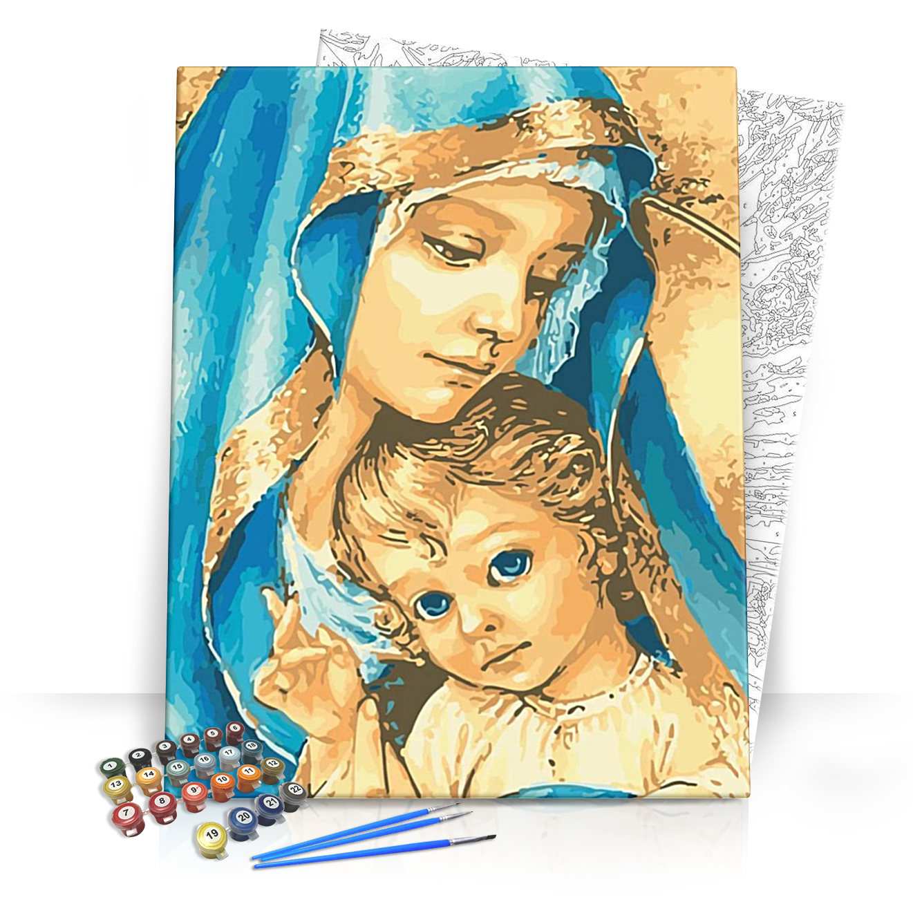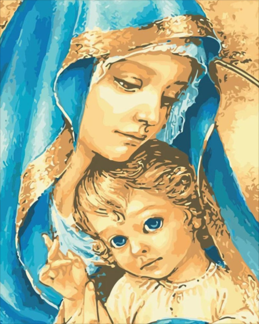 Fedezd fel a festészet varázsát és merülj el a művészet világában a Szeretet - számfestő készlettel! Ez a gyönyörű műalkotás a tisztelet és szeretet érzelmeit idézi fel a Madonna és gyermekének ábrázolásával, amely bájos kék és arany színekkel van megfestve. A kép harmonikus kompozíciója és az érzelmek gazdag kifejezése minden festeni vágyót magával ragad.