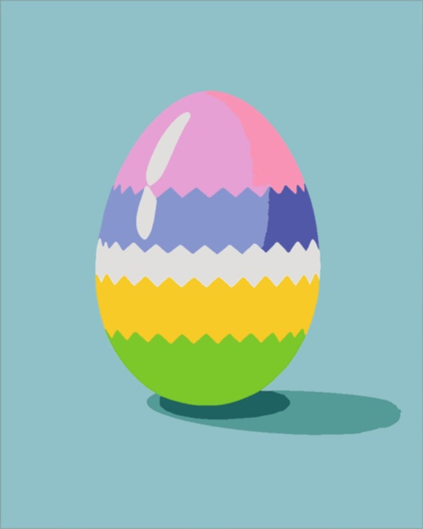 A kép középpontjában egy gyönyörű, színes tojás áll, amelyet árnyékok és fények tesznek élethűvé. A tojás felülete élénk színekben pompázik: rózsaszín, lila, zöld és sárga színű csíkozás ékesíti, amelyek modern, geometriai formákkal kombinálva adják meg a kép dinamikáját. Az enyhe kék háttér kiemeli a tojás vibráló színeit, lehetővé téve, hogy a festett tojás valóban a középpontba kerüljön.