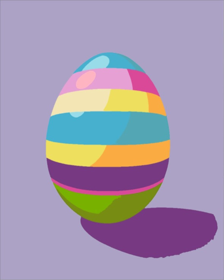 A képen a házi tojás vibráló színekben pompázik: bájos csíkok minden színárnyalatban, mint például a világoskék, pink, sárga és zöld, melyek harmonikus összhangban jelképezik a tavasz szellemiségét. A háttér finom lilás árnyalatával kiemeli a tojás szépségét, míg a halvány árnyék hozzáad egy kis mélységet a kompozícióhoz.