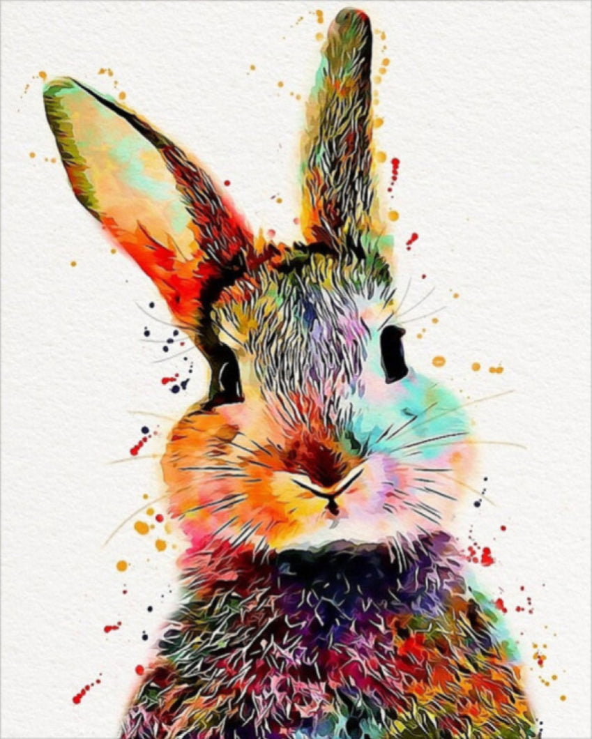 A festmény középpontjában egy színes, barátságos nyuszi áll, akinek arca mindenki szívét elrabolja. A kép élénk színekben pompázik, a nyúl bundájában különböző árnyalatok keverednek, míg a háttérben fűszeres foltok találhatóak, amelyek még inkább kiemelik a nyuszi báját.