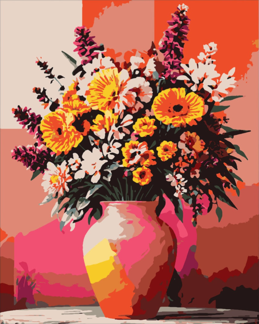 Merülj el a kreativitás tengerében a Színes reggeli ébredés számfestő készlet segítségével! Ez a lenyűgöző festmény egy virágcsokrot ábrázol, élénk akvarell stílusban, amely tele van boldogsággal és élettel. A napsütötte sárga és narancs színek elegyéből álló virágok, mint a napraforgó és gerbera, csodálatosan mutatnak a mesterien kidolgozott vázában, a háttérben pedig a meleg rózsaszínek és pasztell árnyalatok mesés kontrasztot alkotnak.