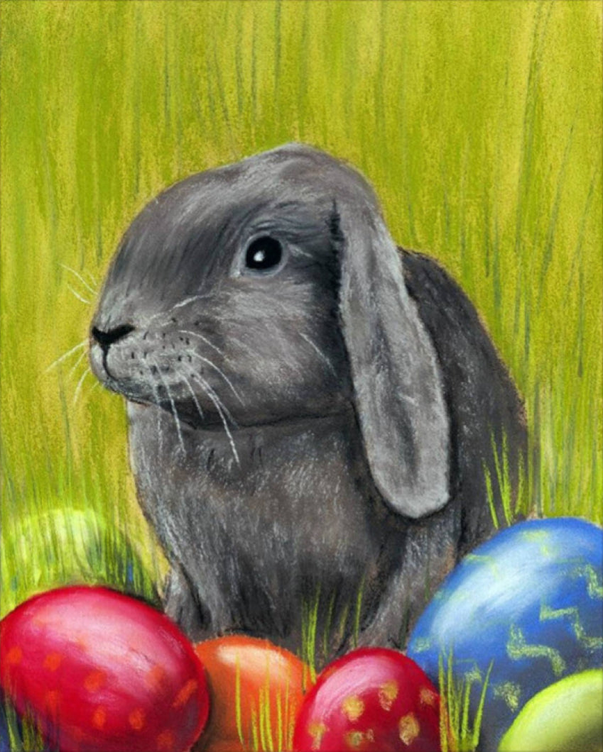 A képen egy aranyos szürke nyuszi látható, amely egy csodálatos zöld fűben ül, körülötte tarka húsvéti tojásokkal. Az élénk színek és a valósághű részletek biztosítják, hogy a végeredmény nemcsak gyönyörű, hanem karaktert is hordoz. A nyuszi bájos arca és a színes tojások vidám atmoszférát teremtenek, mely azonnal magával ragadja a figyelmet.