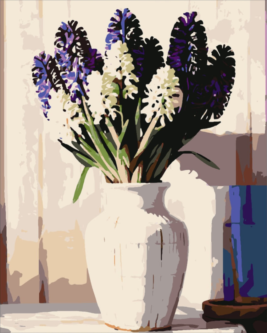 Üdvözöljük a kreatív önkifejezés világában! Ismerje meg a Tavaszi jácint illat - számfestő készlet különleges darabját, amely varázslatosan eleveníti meg a tavasz színeit és illatait. A készlet egy festményeként ragyogó, gyönyörű jácintokból álló csokrot örökít meg, melyek élénk lila és hófehér árnyalataikkal elbűvölő látványt nyújtanak. A virágok egy elegáns, fehér vázában vannak elhelyezve, ami tökéletes kontrasztot alkot a háttér meleg színeivel. A festmény stílusa modern, ám mégis klasszikus elemeket hordoz magában, amely minden otthon díszére válhat.