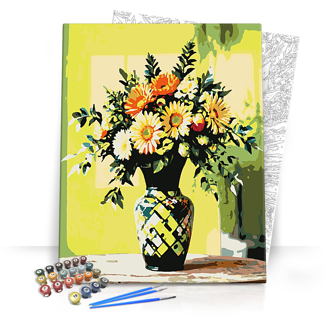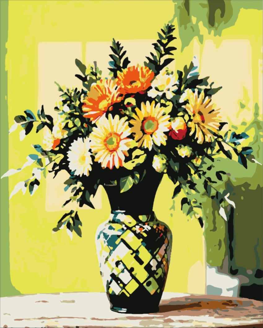 A képen egy csodás virágcsokor látható, amelyben a napraforgók és margaréták ragyogó sárga árnyalatai élettel töltik meg a szobát. A váza kézműves mintázata és friss zöld színei remekül kiegészítik a virágok szépségét, miközben a háttérben a sárgás árnyalatok visszatükrözik a napfény melegét. E festmény minden részlete arra invitál, hogy fess és alkoss!