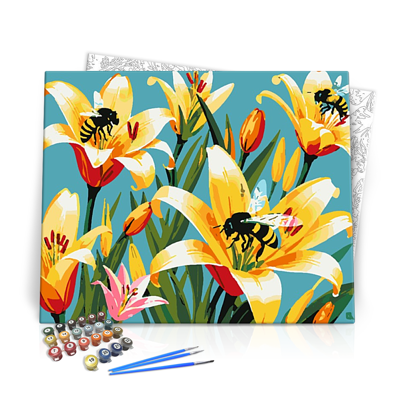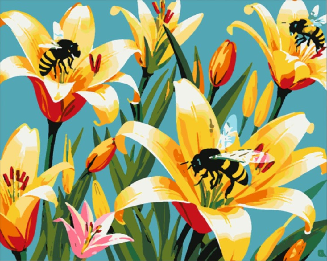 A készletben található színes virágkompozíció, amely sárga liliomokból, piros és rózsaszín virágokból, valamint zümmögő méhekből áll, tele van élettel és vibráló energiával. A háttér gyönyörű türkiz színe kiemeli a virágok élénk árnyalatait, így mindenki számára vonzó látványt nyújt. Az egyes mezők és kontúrvonalak világosan jelzik a festendő részeket, így akár előzetes festői tudás nélkül is könnyedén alkothatsz.