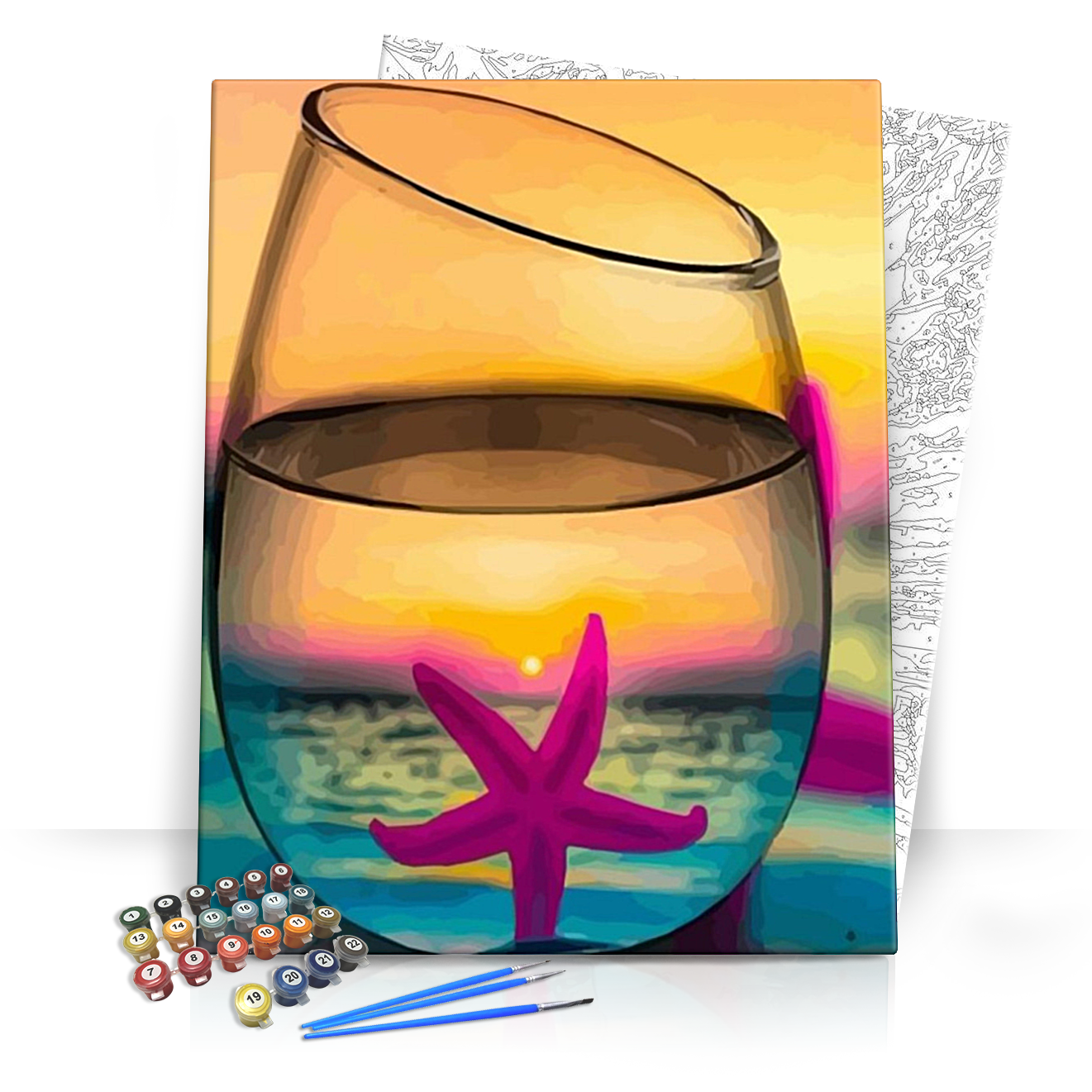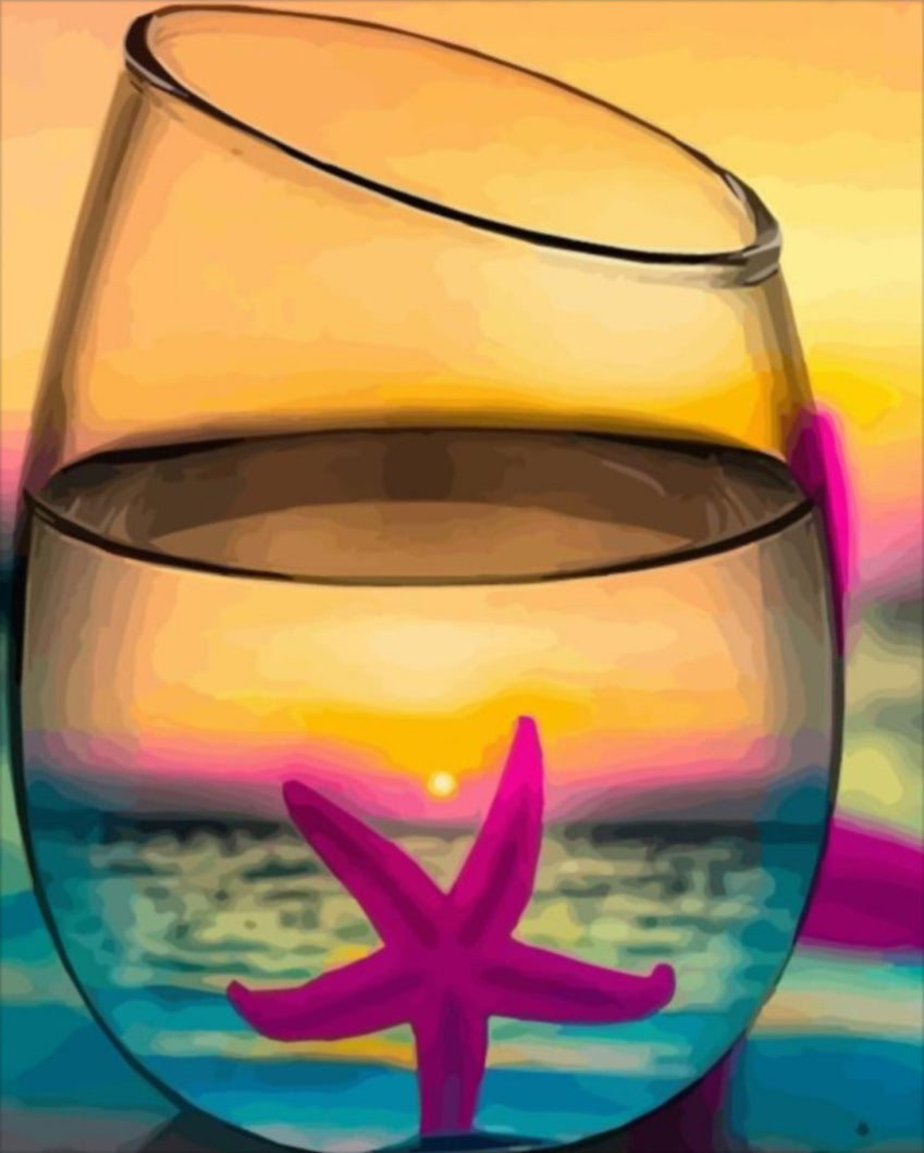 Merülj el a festés csodálatos világában a Tengericsillag számfestő készlettel! Ez a lenyűgöző kép a tenger mélységét és a naplemente varázslatos színeit idézi meg. A dupla pohárba zárt tengericsillag és a háttérben lebukó nap mesés képet alkot, amely felfrissíti a szíveket és megnyugtatja a lelket. Élvezd a festés minden pillanatát, ahogy a színek életre kelnek a vásznon!