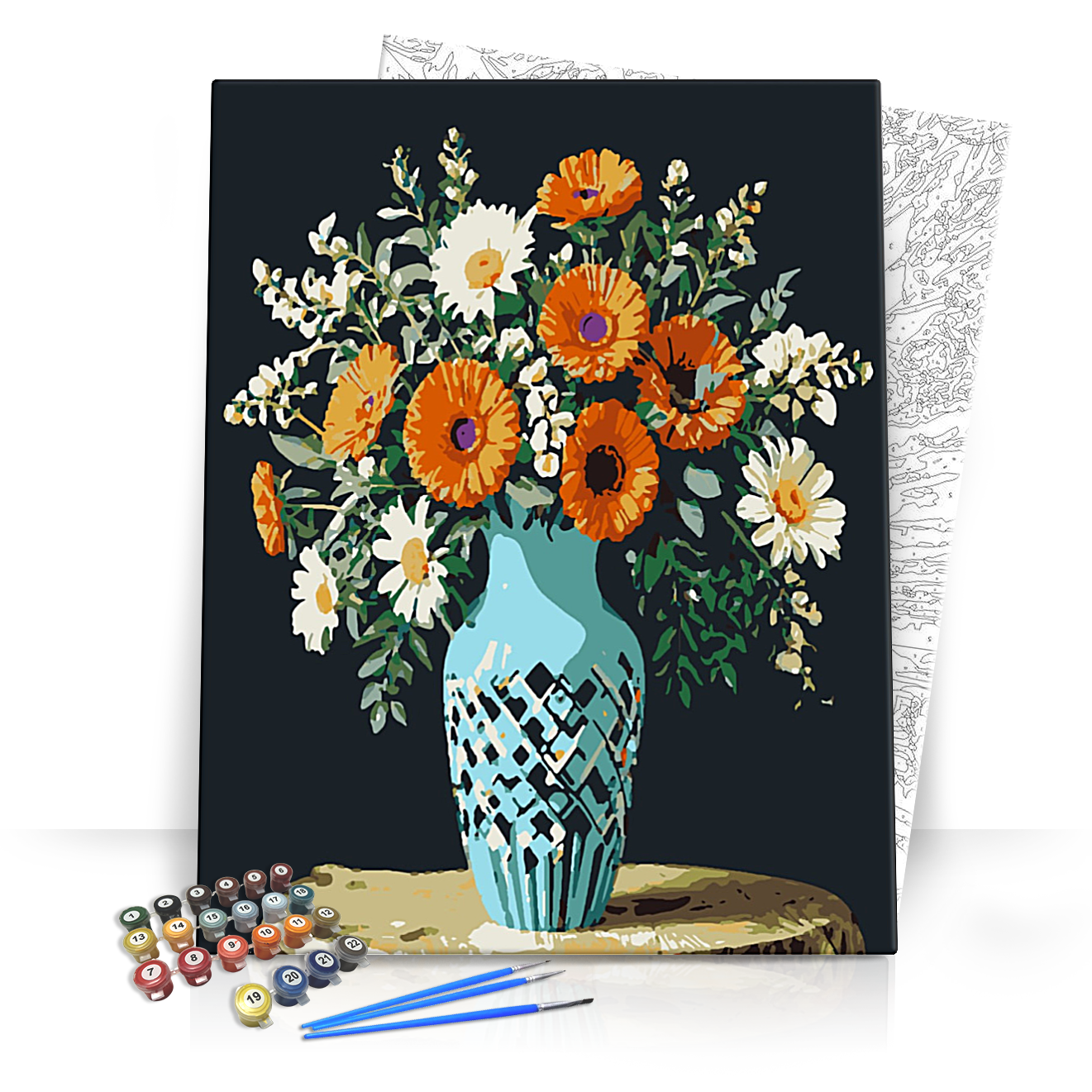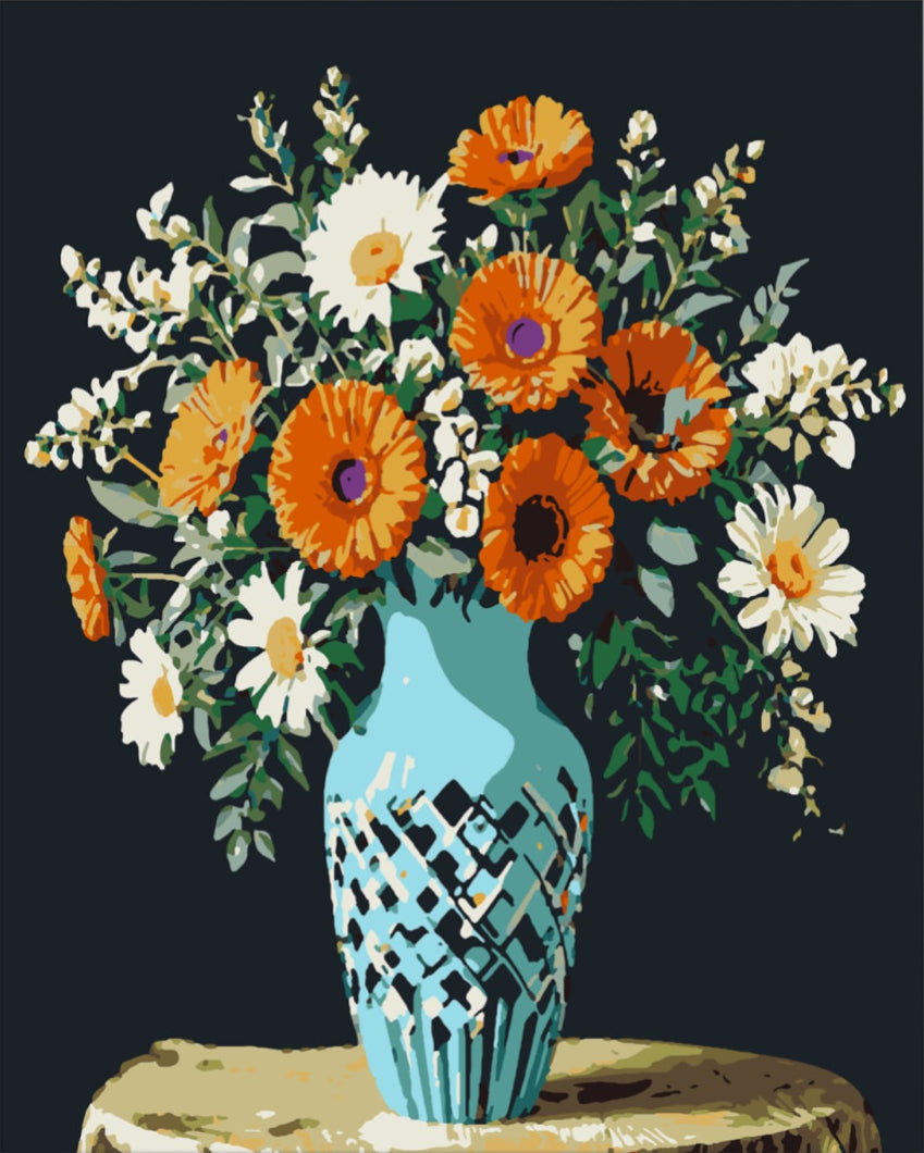 Ismerje meg a Tengerparti virágsziget számfestő készletet, amely egy igazi műalkotást varázsol a kezei közé! Ez a gyönyörű, színes virágkompozíció egy csodás, tengerkék vázában pompázik, élénk narancssárga és fehér virágokkal, zöld levelekkel körülölelve. A sötét háttér kiemeli a virágok szépségét és élénkségét, így a festmény friss és vibráló hangulatot áraszt, megidézve a nyár varázsát.