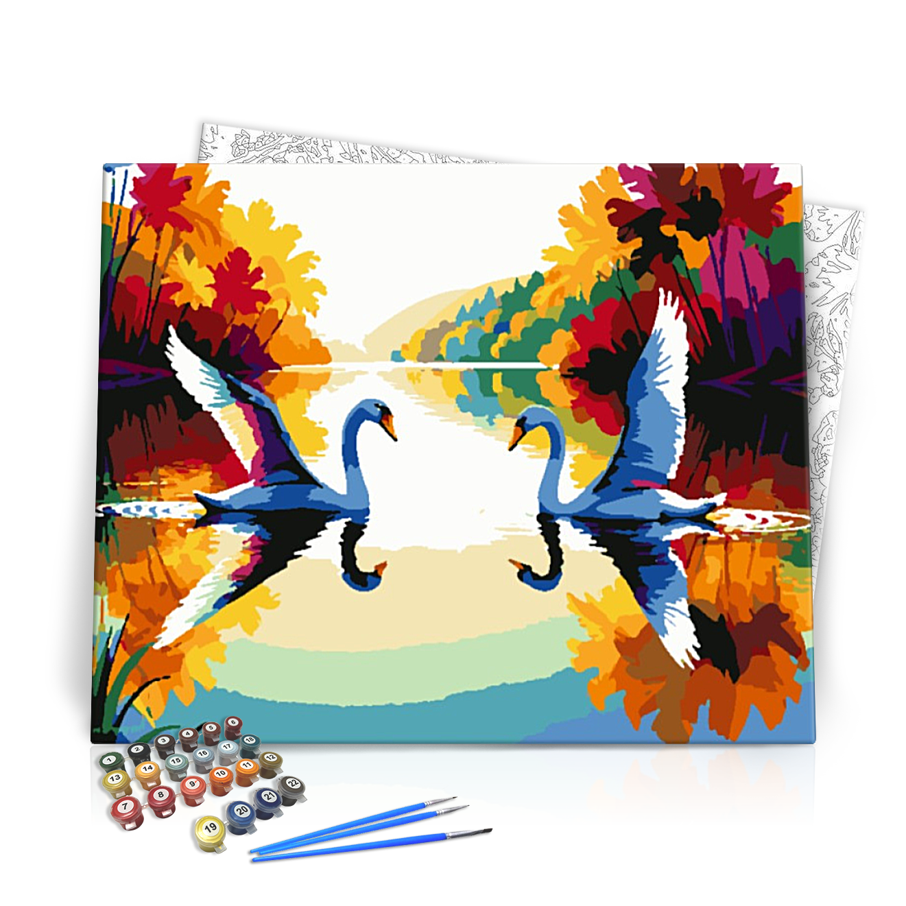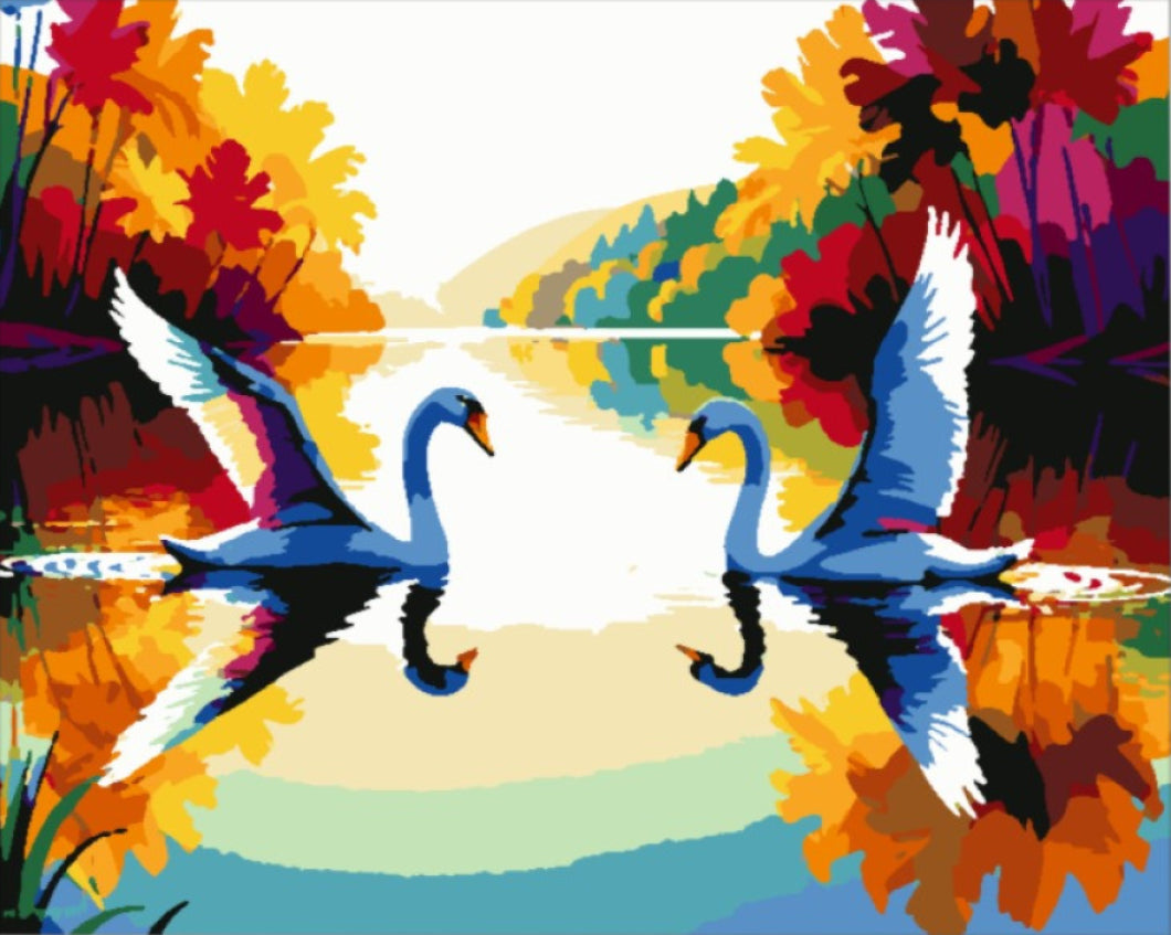 Képzelj el egy tavaszi időszakot, ahol a természet színei egy varázslatos tükörképet alkotnak a vízen. A Tükröződés a Folyón képen gyönyörű hattyúk úsznak a békés víz felszínén, míg a körülöttük lévő őszi falevelek élénk színei tükröződnek a vízben. Ez a festmény nemcsak a lenyűgöző tájat jeleníti meg, hanem az élet és a harmónia szimbolikáját is. A színek életteli palettáján a narancs, piros és zöld árnyalatok dominálnak, míg a hattyúk fehér és kék tónusaival érdekesen kontrasztálnak.