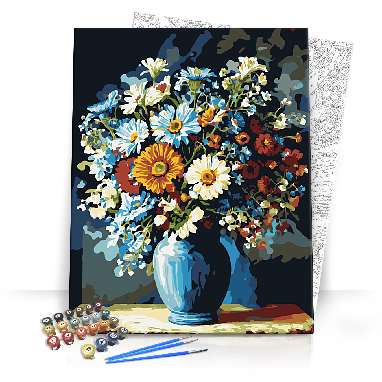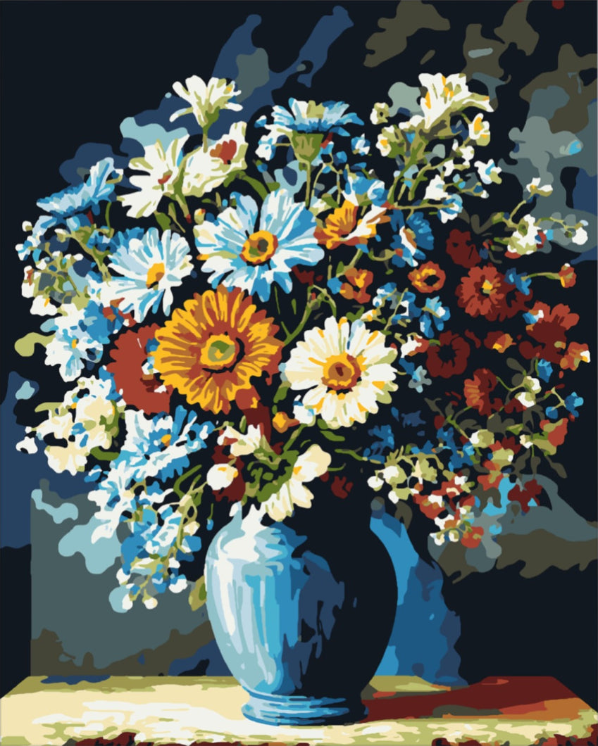 Fedezd fel a Tündöklő margaréták számfestő készlet varázslatos világát, ahol a festés öröme és a természet szépsége egyesül! Ez a lenyűgöző virágkompozíció egy vidám és színes csokrot ábrázol, tele élénk margarétákkal és más virágokkal, amelyeket a kék vázában láthatunk. A háttér sötét árnyalata még inkább kiemeli a virágok ragyogó színeit, így tökéletes dísze lehet bármelyik otthonnak.