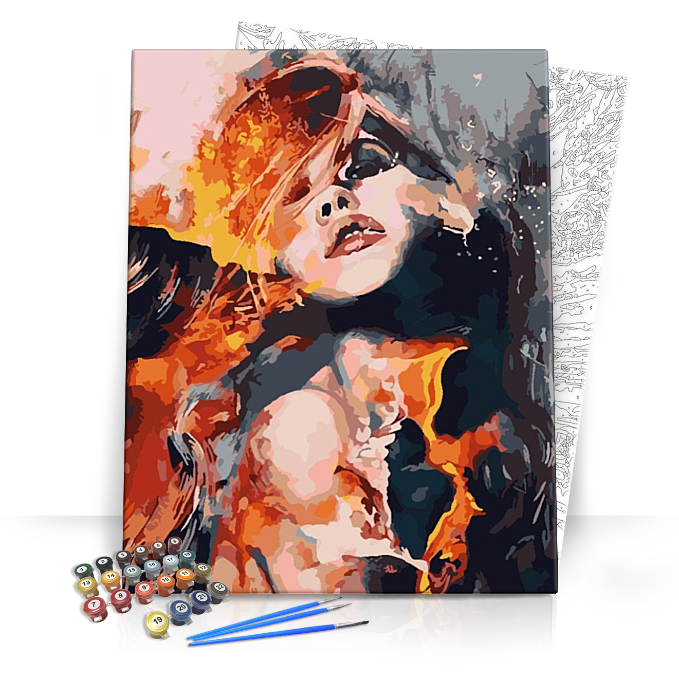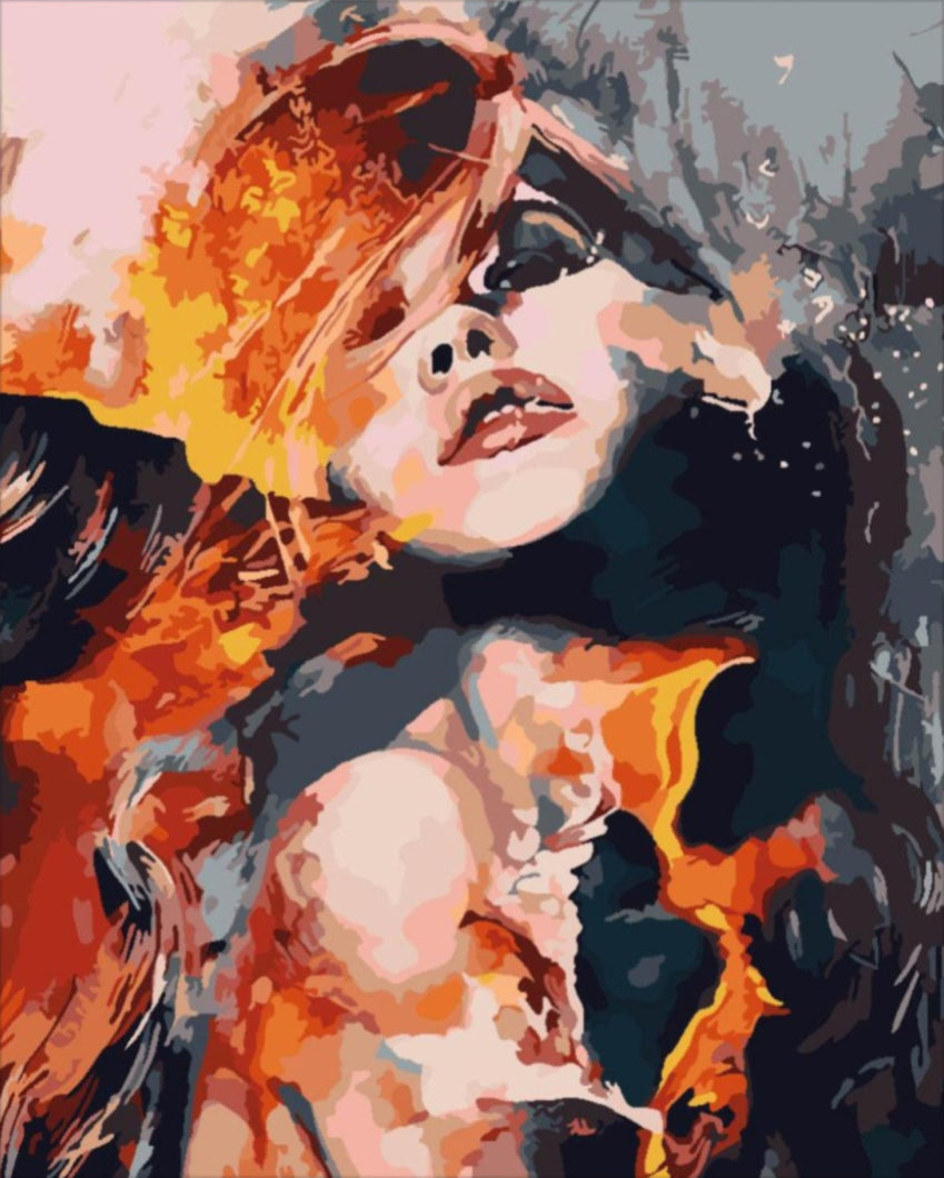Fedezd fel a művészet világát a Tüzes lány - számfestő készlet segítségével! Ez a lélegzetelállító kép egy tüzes, vonzó női alakot ábrázol, melynek haja lángoló árnyalatokban pompázik. A tűz vibráló narancs és piros színei keverednek a szürke és fekete hűvös tónusaival, amely lenyűgöző kontrasztot teremt. A kép dinamikus érzést kelt, és lehetőséged nyílik arra, hogy saját színeiddel új életet lehelj a vászonba!