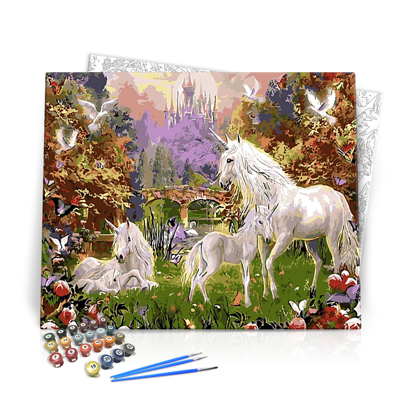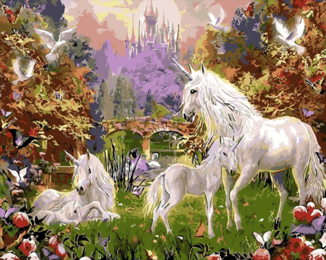 Merülj el a mesebeli varázslatban, és fedezd fel az Unikornis Család festői világát! Ez a lenyűgöző számfestő készlet nemcsak egy műalkotás létrehozásának lehetőségét kínálja, hanem egy varázslatos kalandot is, ahol a fantázia és a kreativitás találkozik. Az elképzelt tájban három tündéri unikornis és a pompás természet találkozik, a háttérben pedig egy mesebeli kastély és színes virágok nyújtanak lenyűgöző látványt.
