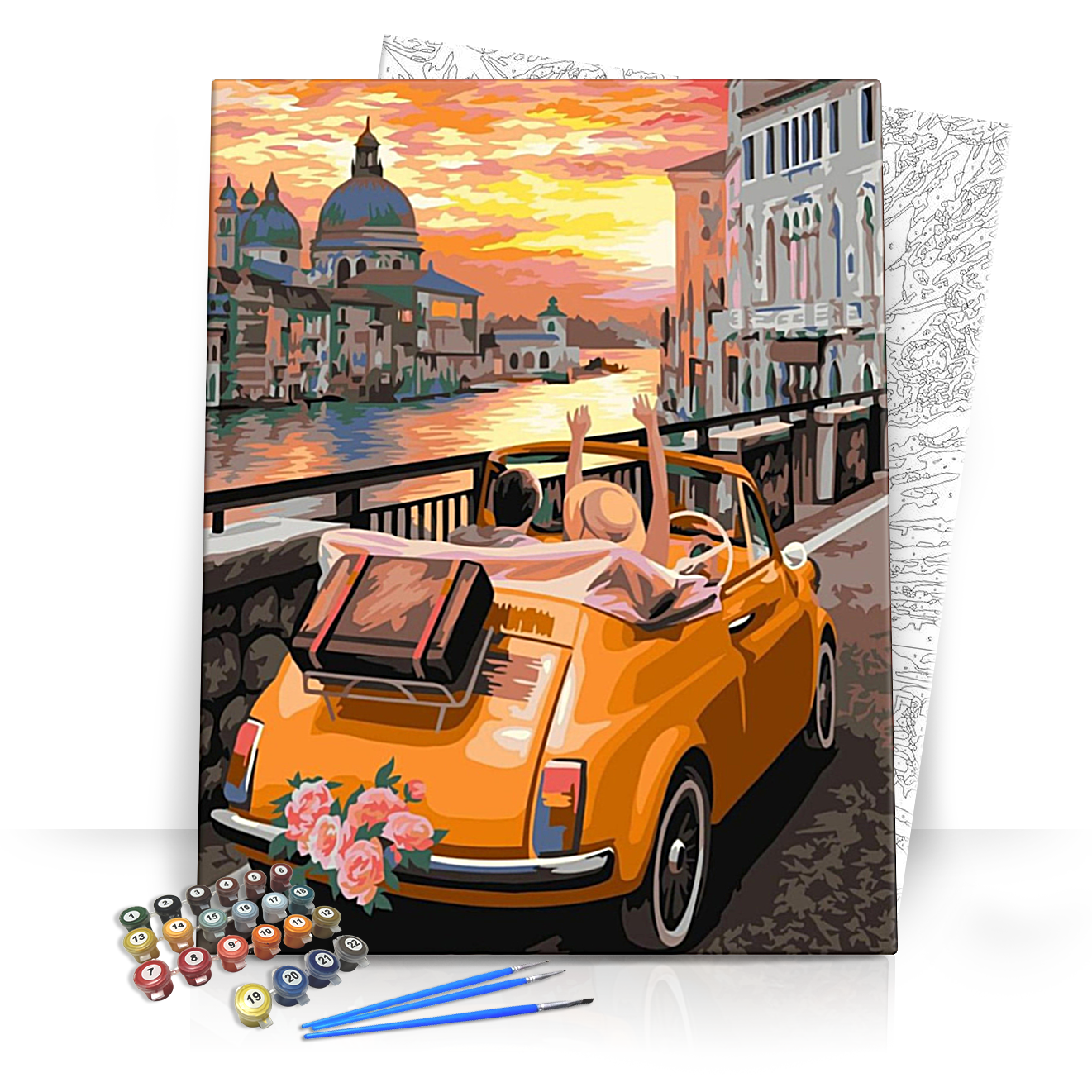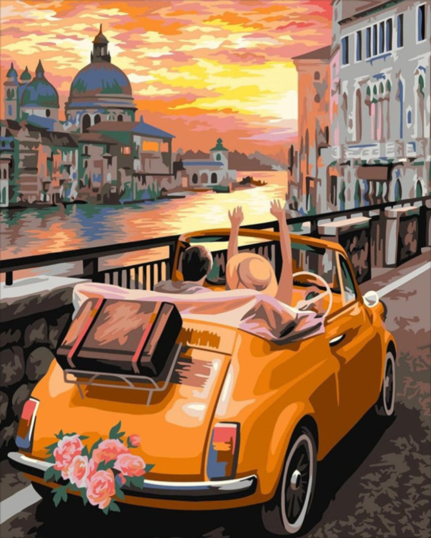 Merülj el a színek és a kreatív alkotás világában az Utazás - számfestő készlet segítségével! Ez a gyönyörű készlet lehetőséget ad arra, hogy te is részese lehess egy varázslatos pillanatnak, ahol a naplemente fényei játszanak a víz felszínén és egy boldog pár élvezi az élet minden örömét egy klasszikus autóban. Az izgalmas, élénk narancssárga autó, a romantikus rózsák és a varázslatos városkép mind arra vár, hogy életre keljen a te kezeid által!